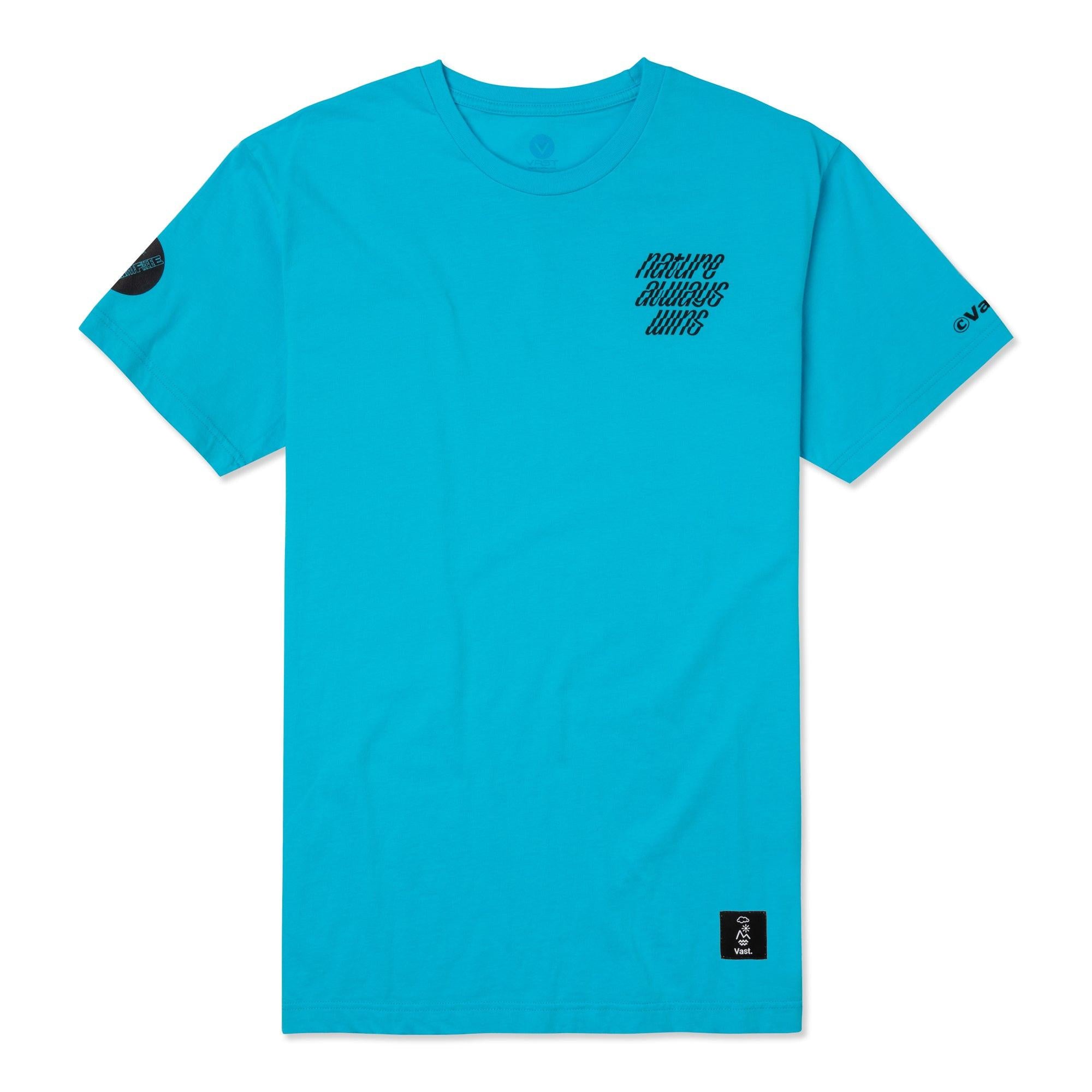 Nature Always Wins™ graphic text on front left chest. Designed by typography artist CJ Dunn. Deconstructed and distorted graphic text on back with abstract nature photo montage. Vast Elements patch on front left hip. Premium fit t-shirt made from 100% ring spun combed Cotton with side seams and a ribbed collar. Available in Tan, Blue and Aqua.
