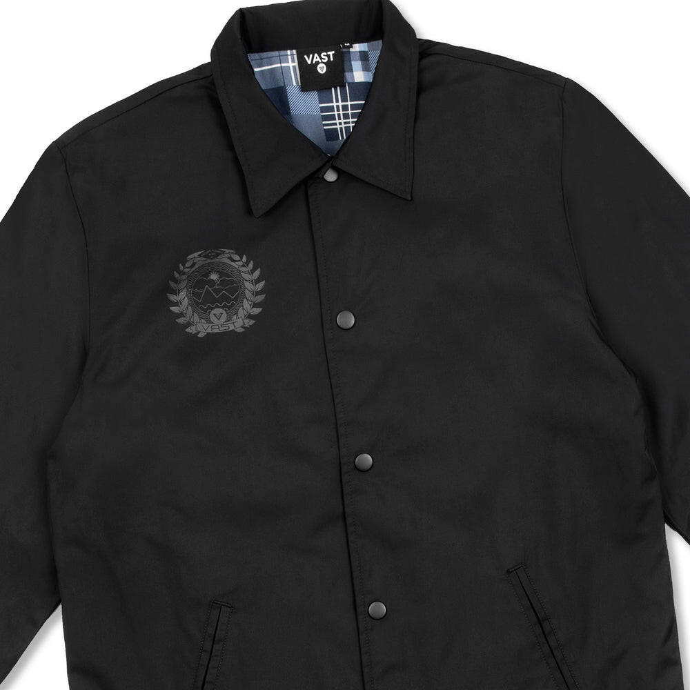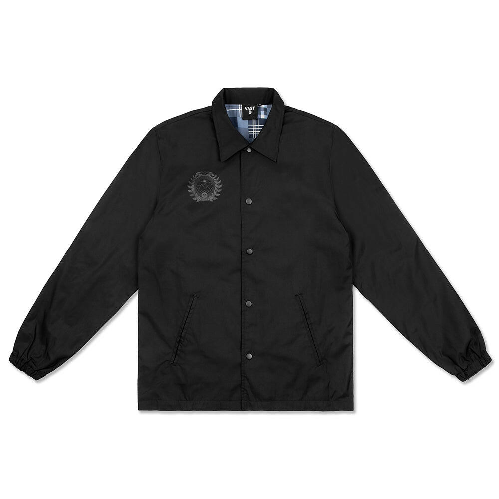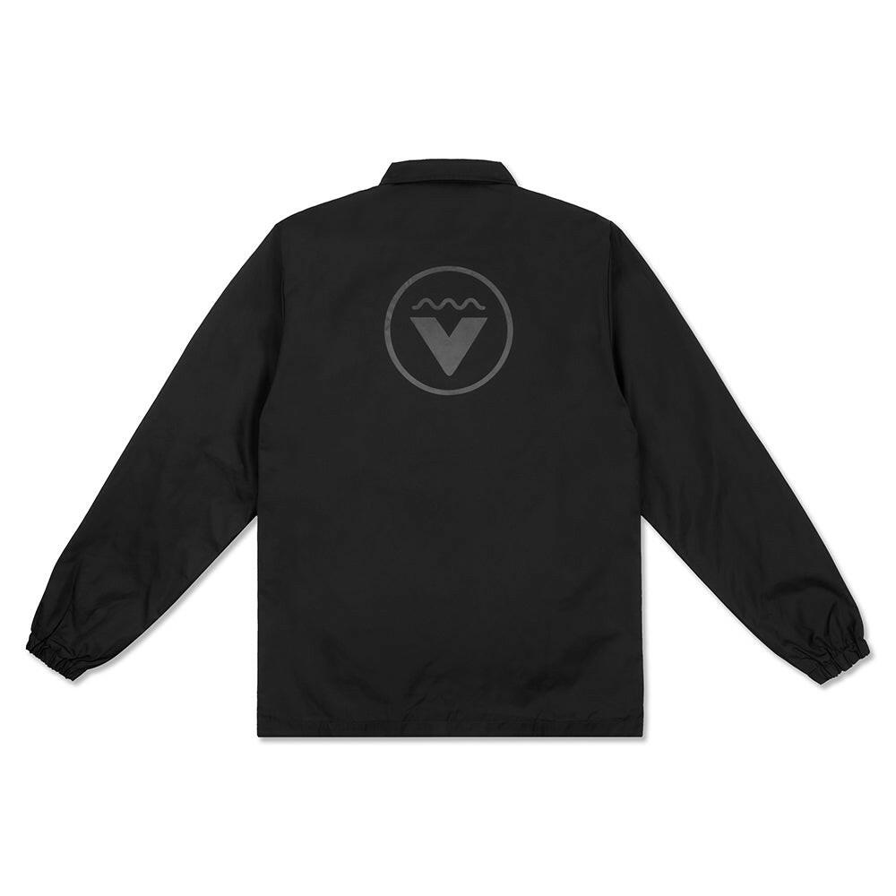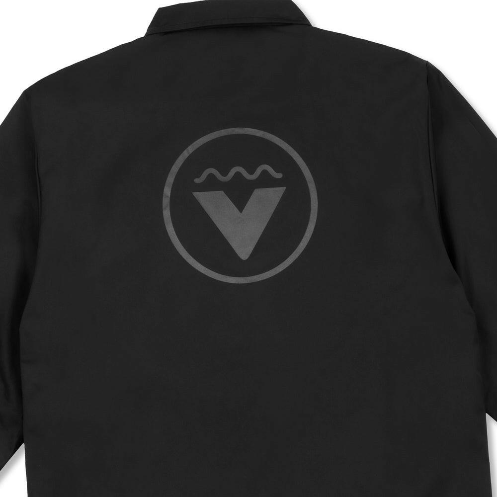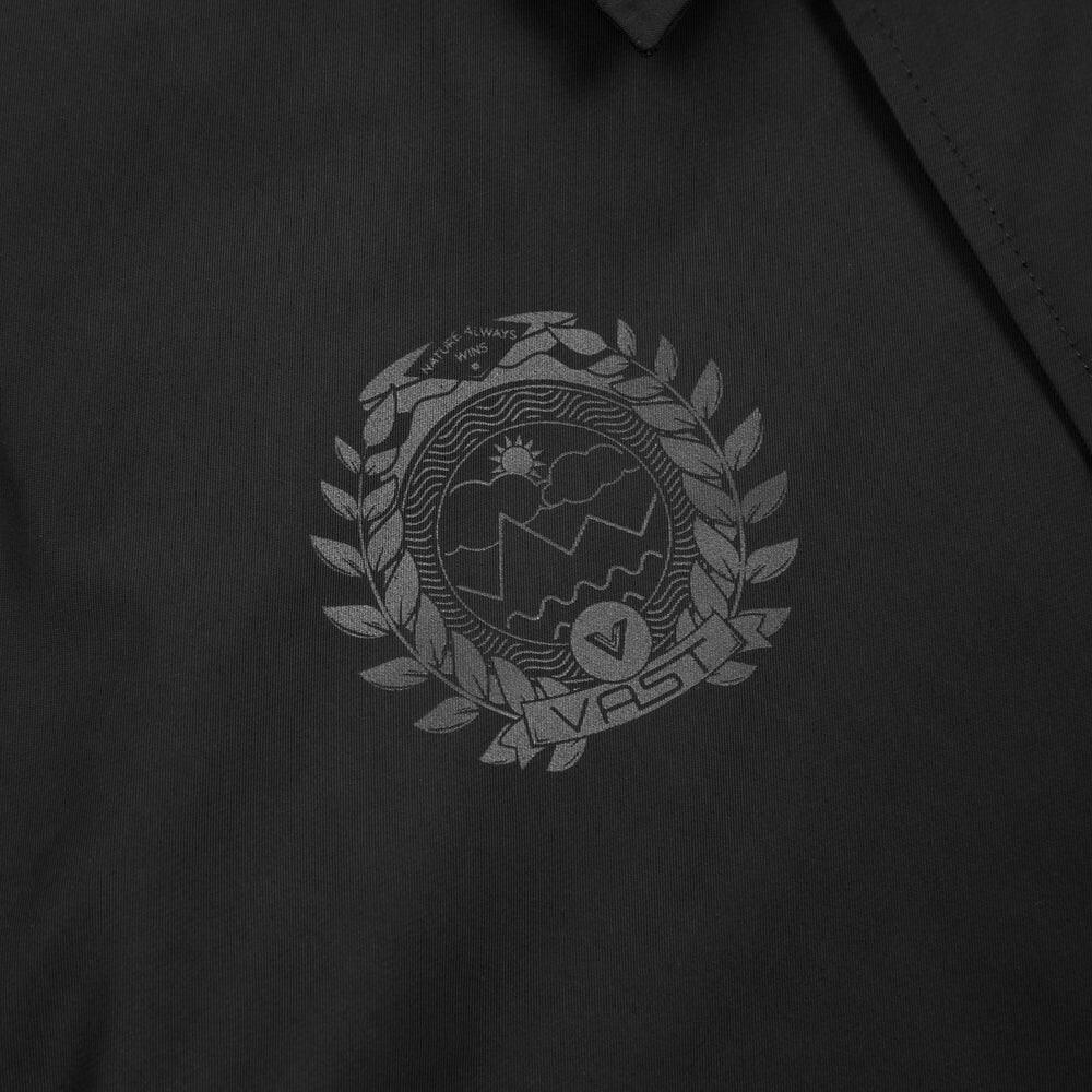 這款VAST Between Waves 鈕扣夾克設計簡約俐落,右胸前飾有VAST Medallion 標誌,背部中央則印有VAST 圓形標誌,展現品牌識別細節。