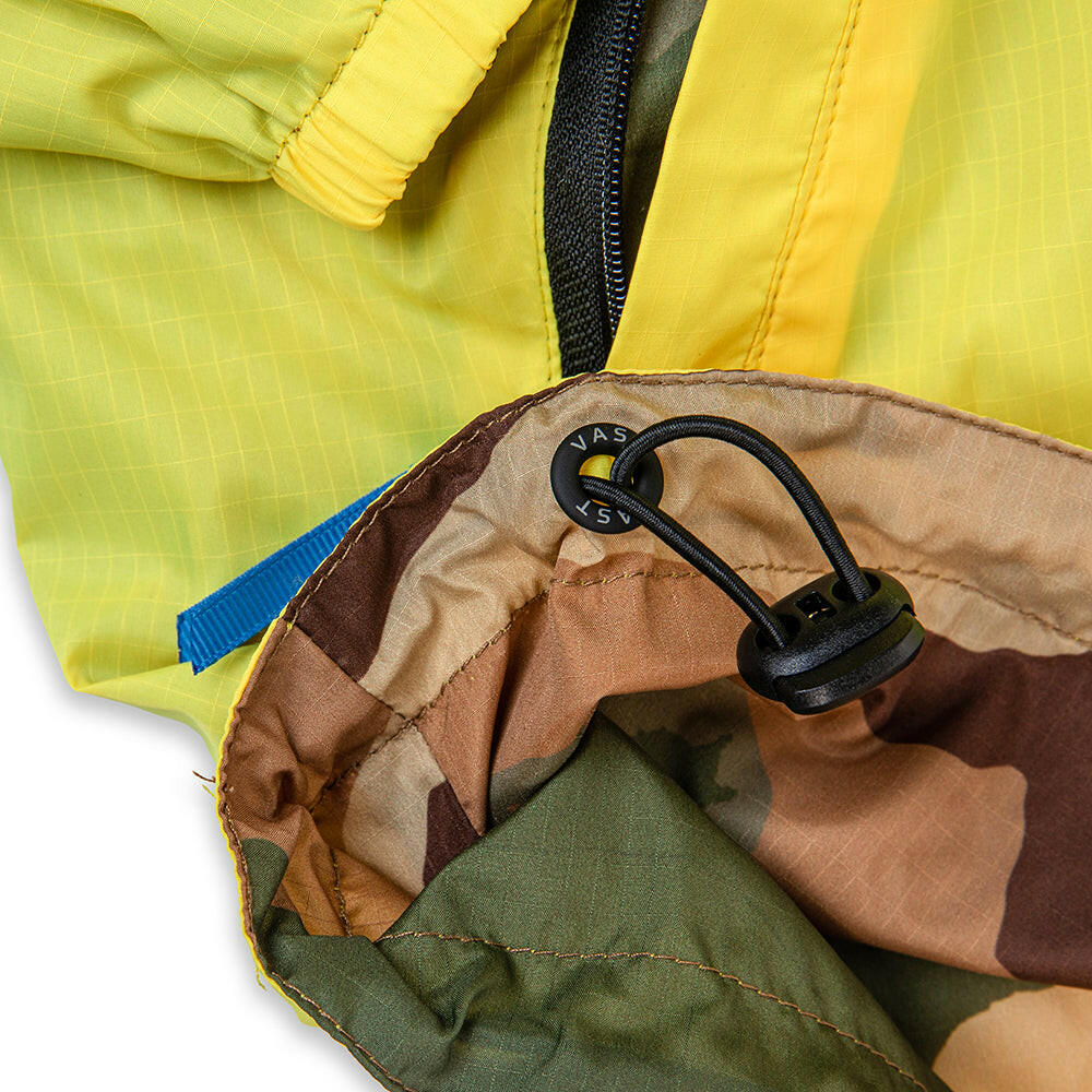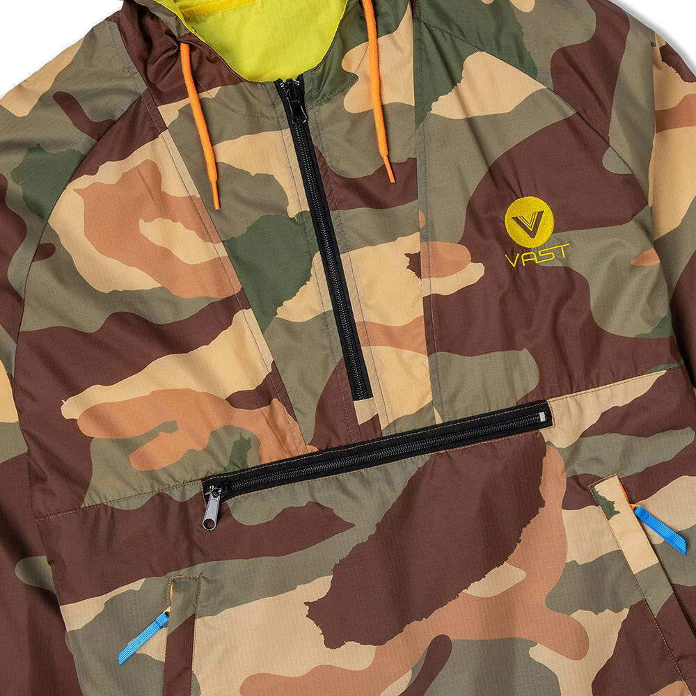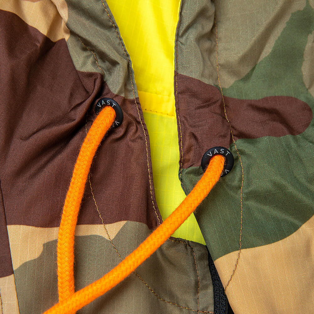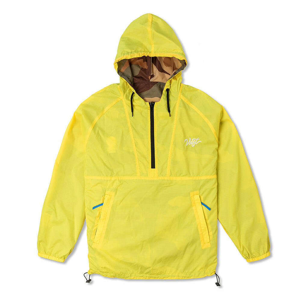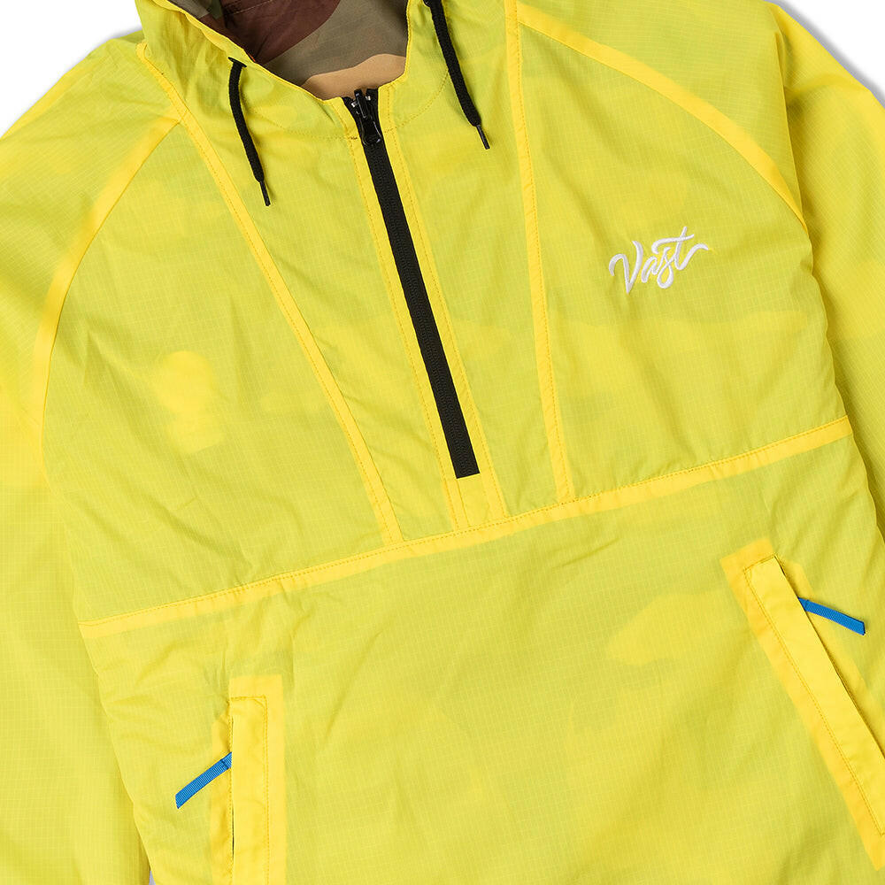 VAST 此款 可翻轉防風夾克一面採用迷彩印花設計,左上胸部織有圓形V標誌。另一面為純黃色,左上胸部印有VAST字樣標誌。