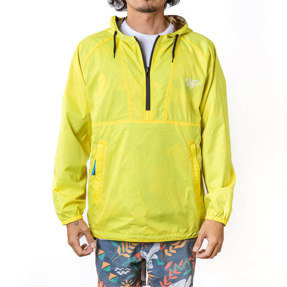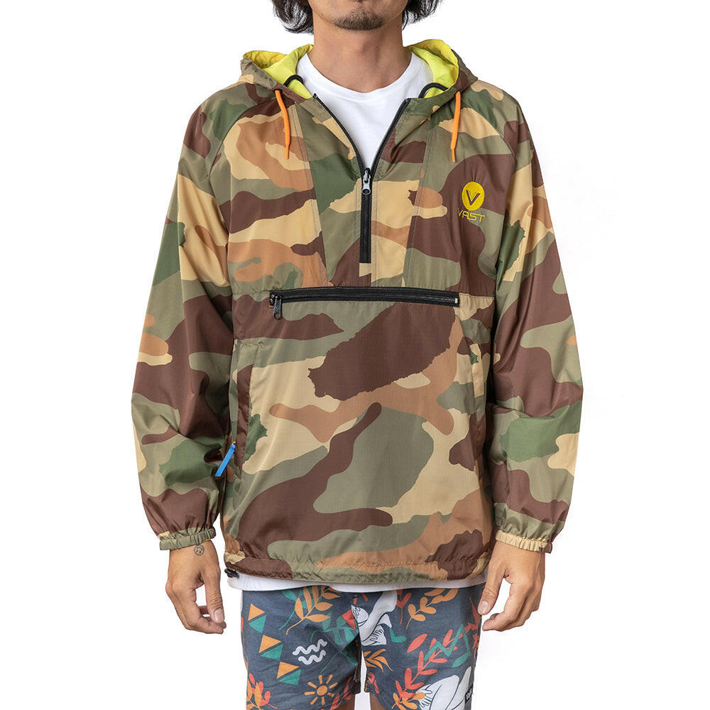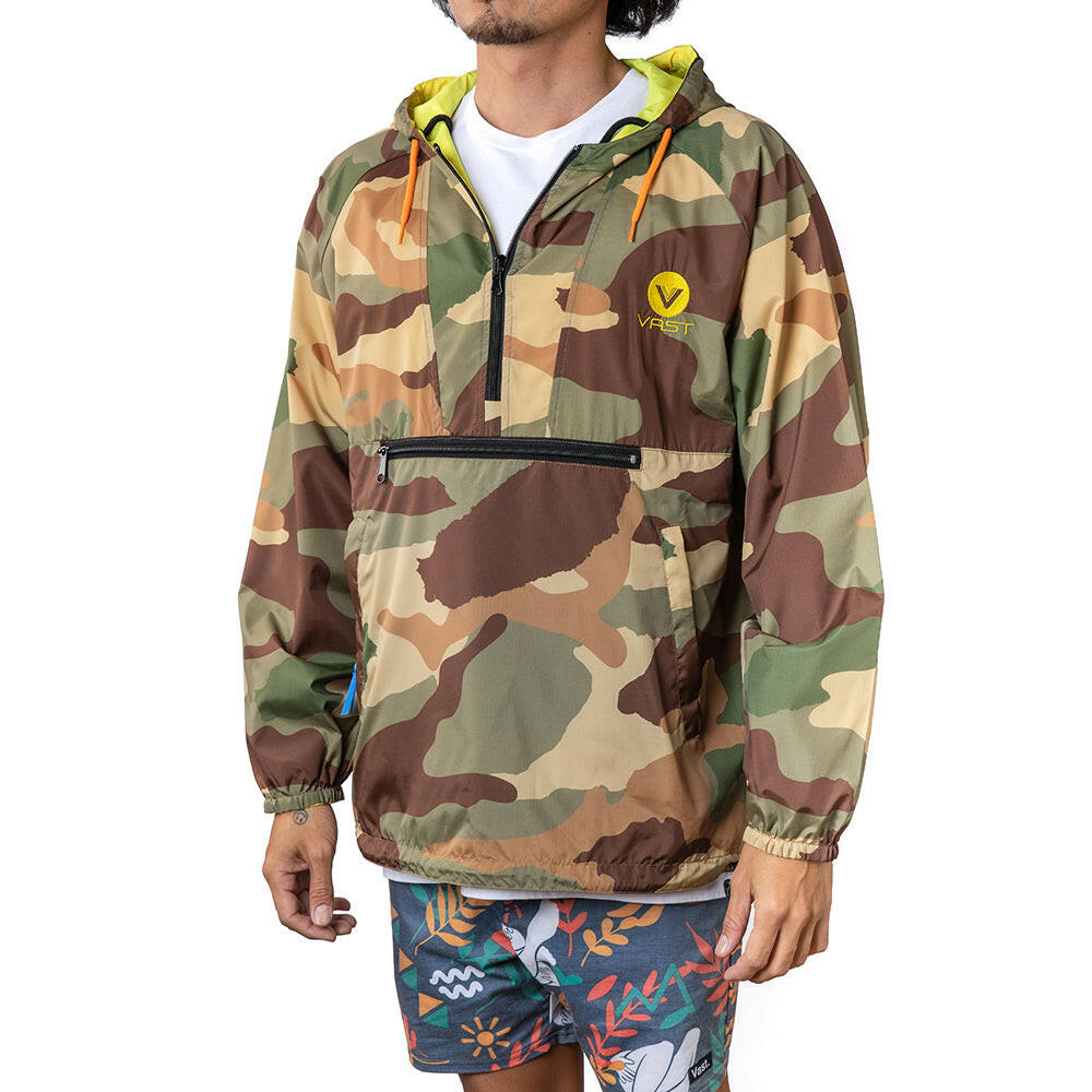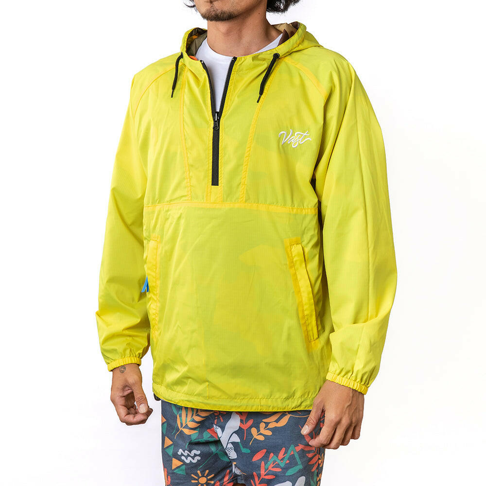 VAST 此款 可翻轉防風夾克一面採用迷彩印花設計,左上胸部織有圓形V標誌。另一面為純黃色,左上胸部印有VAST字樣標誌。