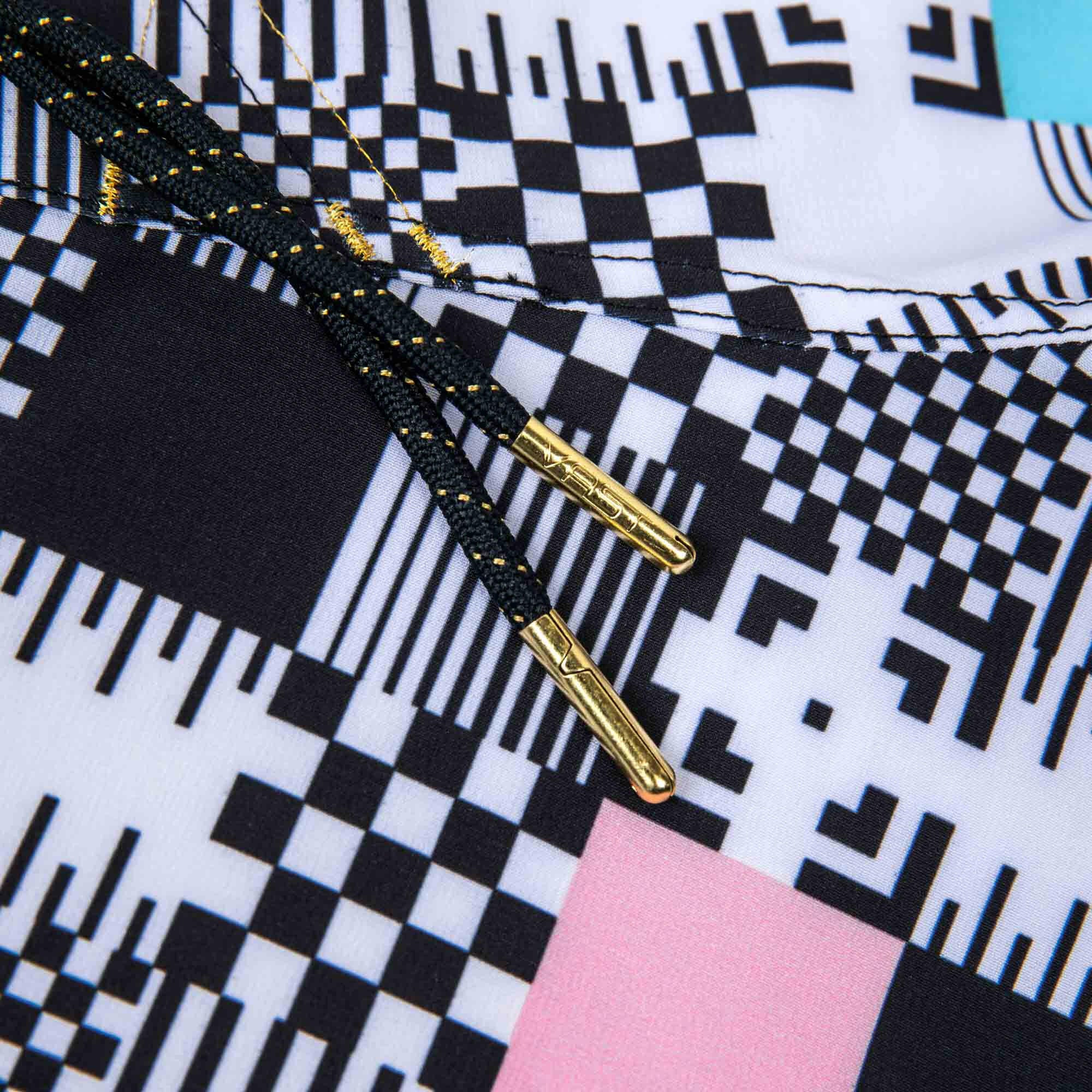 Static horizontal lines, checkerboards and vertical geometric shapes clash in our vibrant Chex & Balances board shorts. Aqua accents, gold lining and fluro hues combine to turn the volume up. Right rear pocket with zipper closure. Vast 2021 Gold Series Features: Partially fused seams with welded athletic tape at lower hips. Made of 50% Recycled Poly, 43% Cocotex and 7% Spandex blend. Available in Sky.