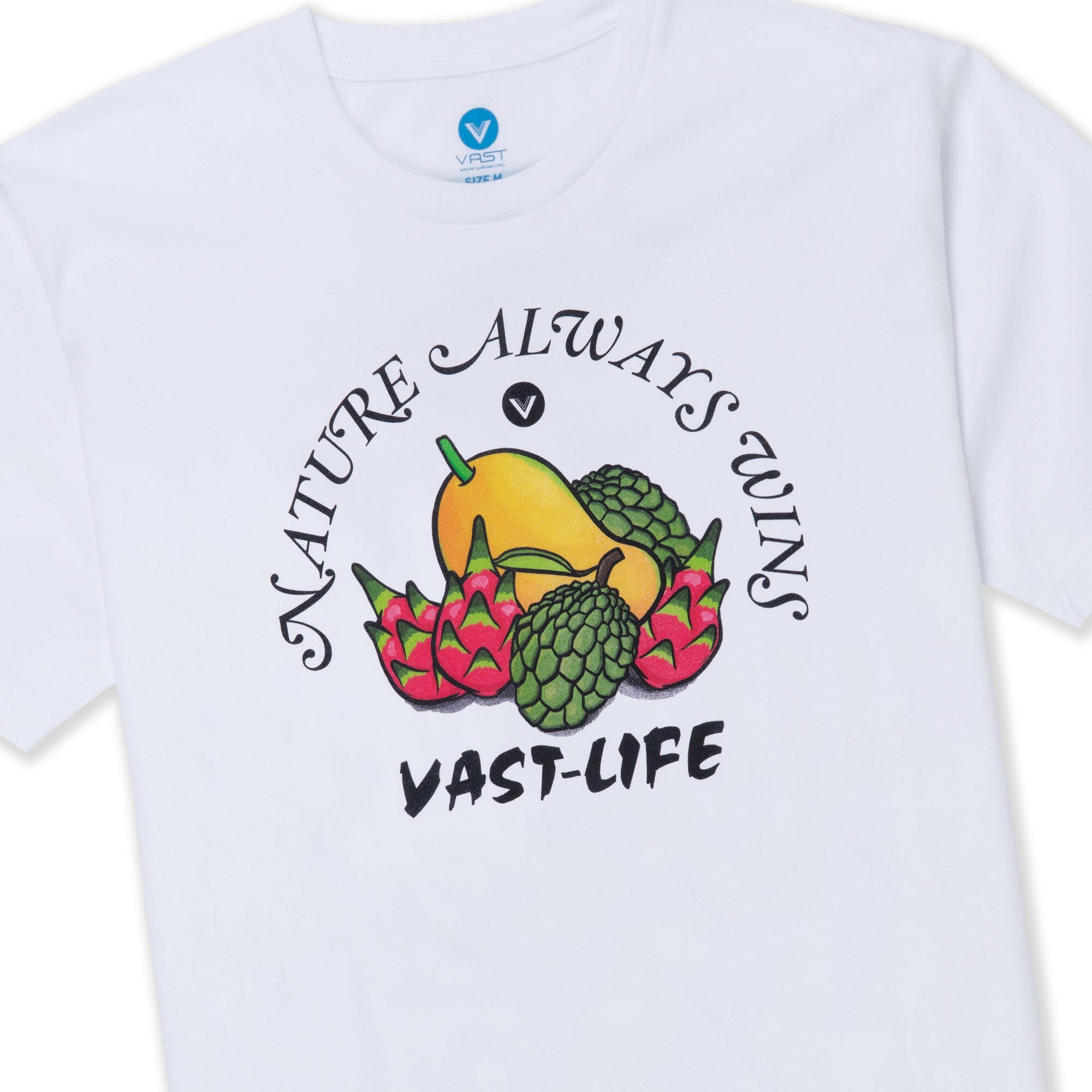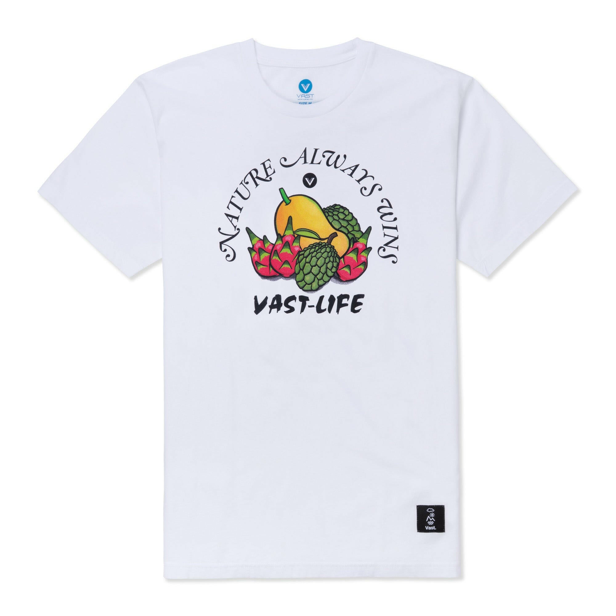 Fruit life inspired graphic tee. Plant life for the best life. Nature Always Wins™ over the top with Vast Life print below. Vast block logo printed on back shoulder centered. Vast Elements patch on front left hip. Premium fit t-shirt made from 100% ring spun combed Cotton with side seams and a ribbed collar. Available in Classic White and Black.