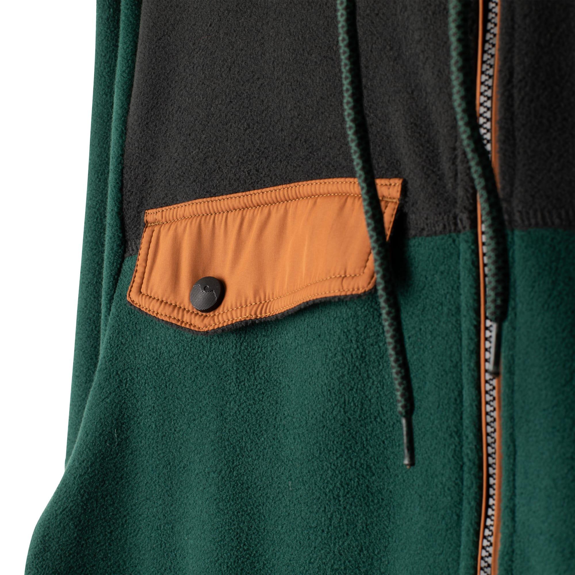 沉穩的墨綠色與萬年百搭的黑堆疊拼接,讓穿搭更有型,口袋再以焦糖橘點綴細節,低調中又不失設計,絨毛材質連帽款式,以簡單設計呈現自然不做作的玩野風格,為城市潮流不容錯過的單品。商品特色:設有多口袋,方便收納隨身物品胸前拉鍊設計,方便穿脫不費力袖口鬆緊剪裁,降低冷風進入連帽處抽繩,隨心調整帽子大小材質:7.5oz 100% polyester