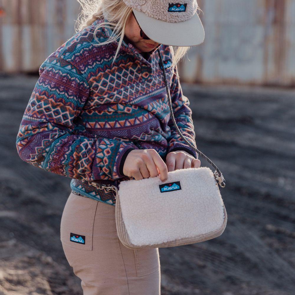 VAST 型格選品 - 來自美國西雅圖 戶外品牌 KAVU 這款 So Snuggy 迷你斜背包彰顯冬季休閒時尚的氛圍感,採用毛茸茸的夏爾巴羊毛製成,搭配燈芯絨拼接,更顯格調;寬敞的收納空間,可放置隨身小物,拉鍊開口讓取物跟方便,肩帶為可拆式的攀岩繩帶,可作為一天出遊的簡單小包,無論穿搭是休閒率性又或是清新甜美都百搭易襯,是款城市型格潮人秋冬必備的單品,建議可與同系列的帽款搭配。