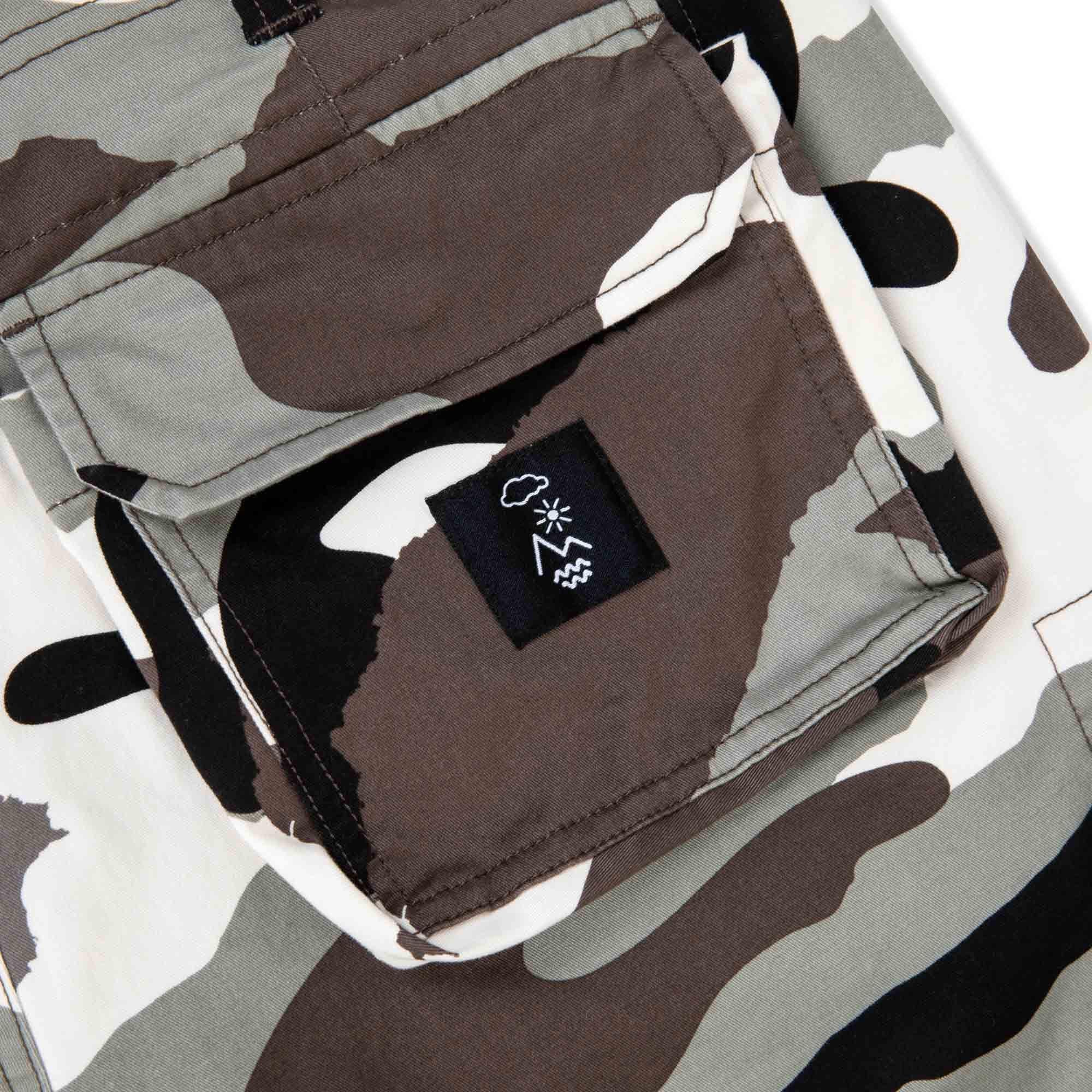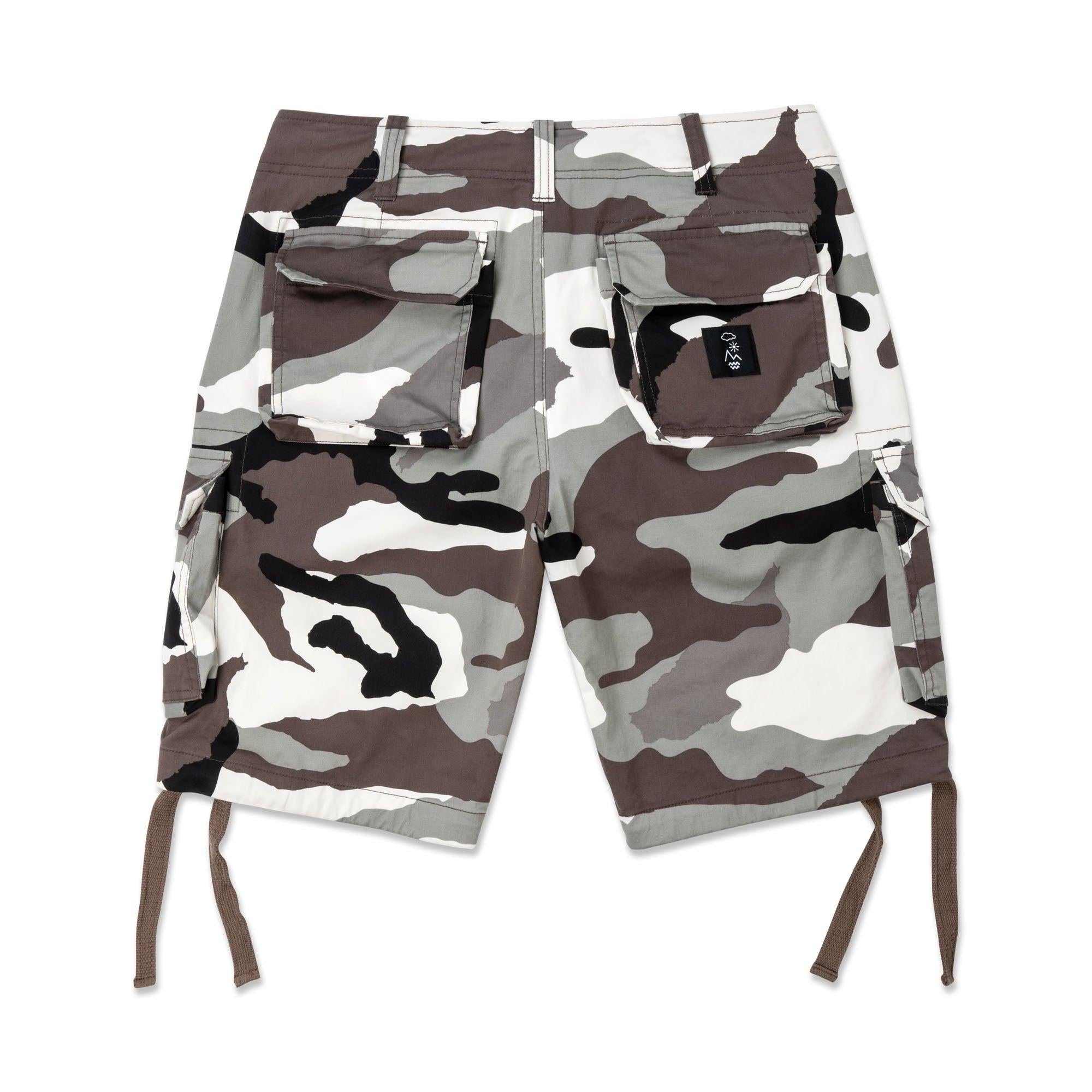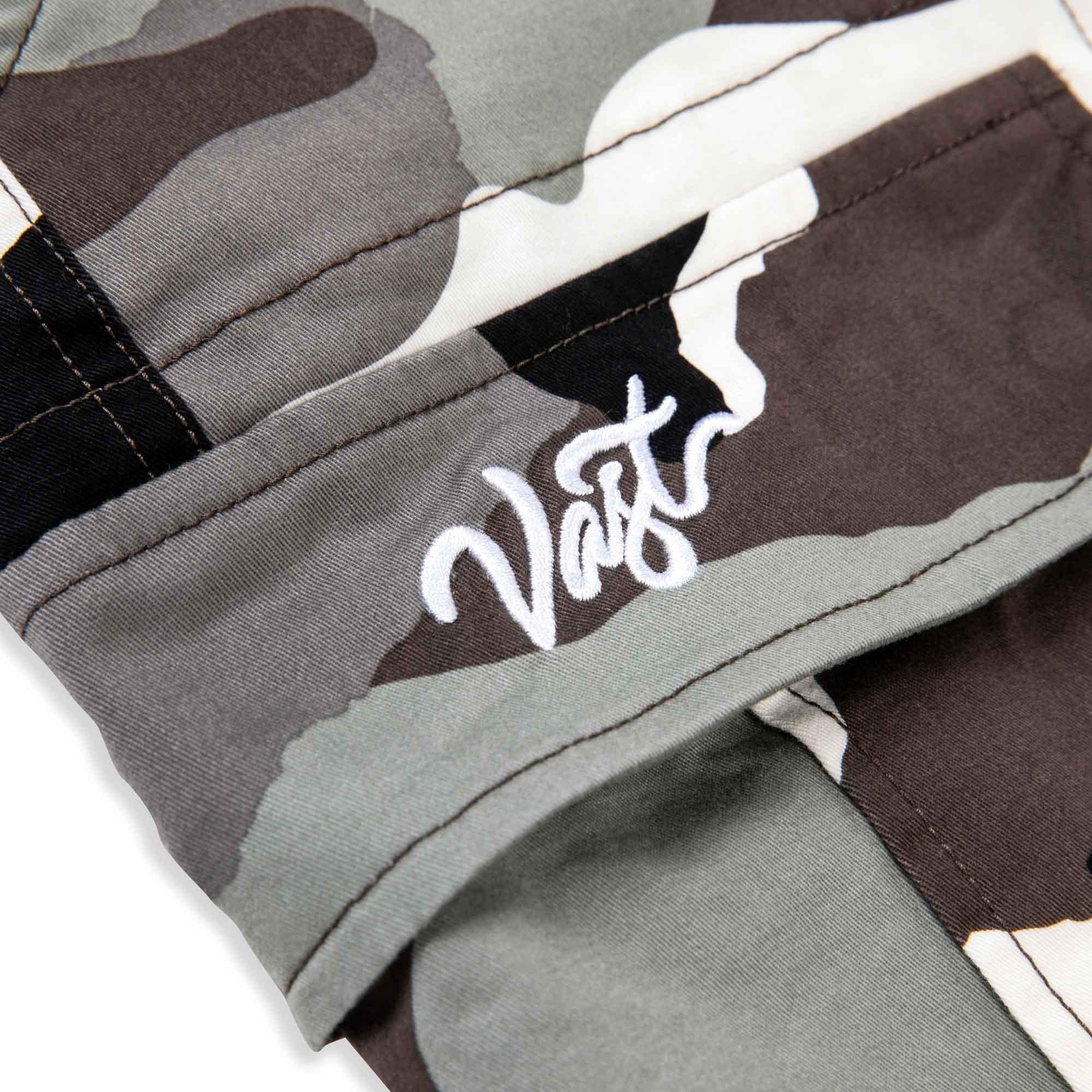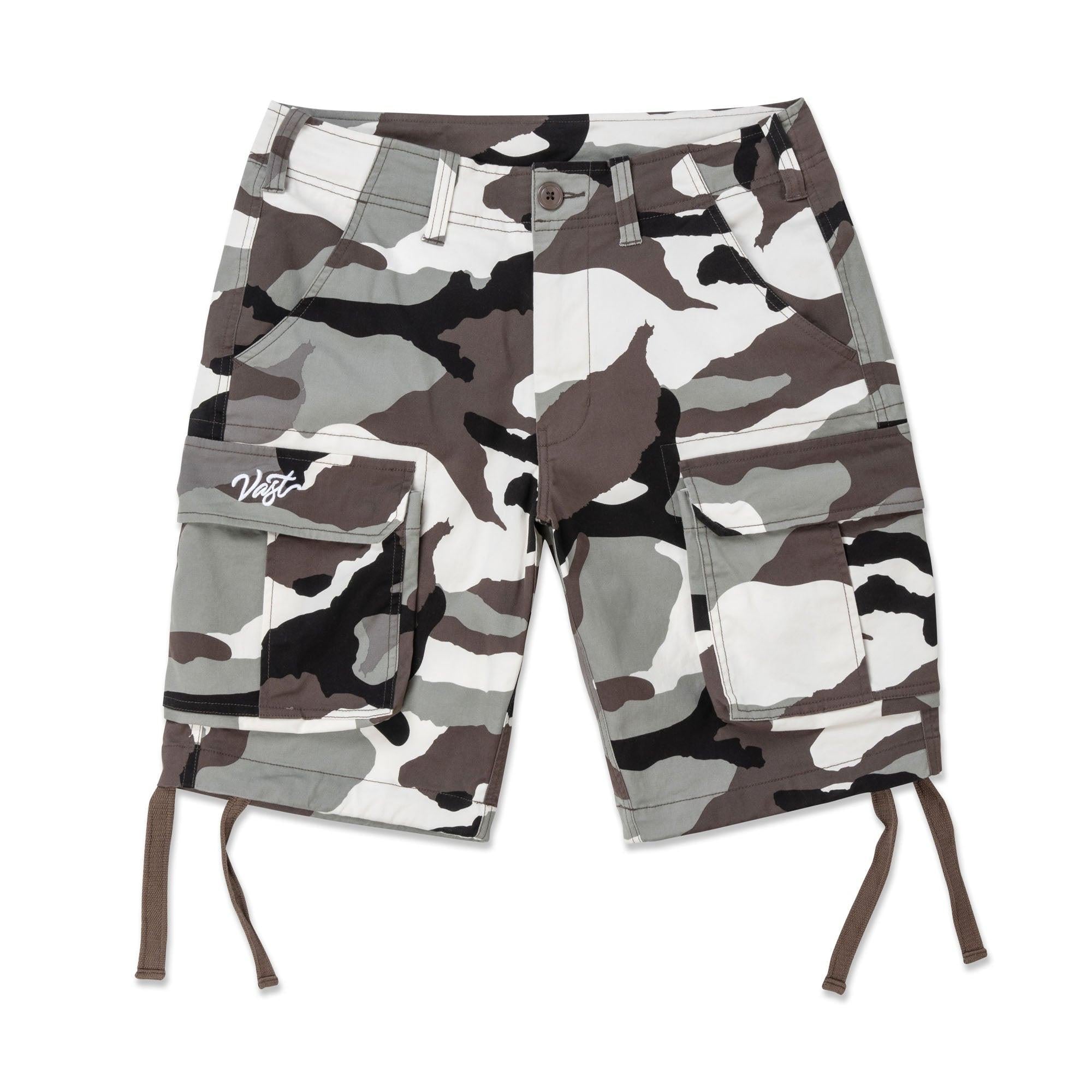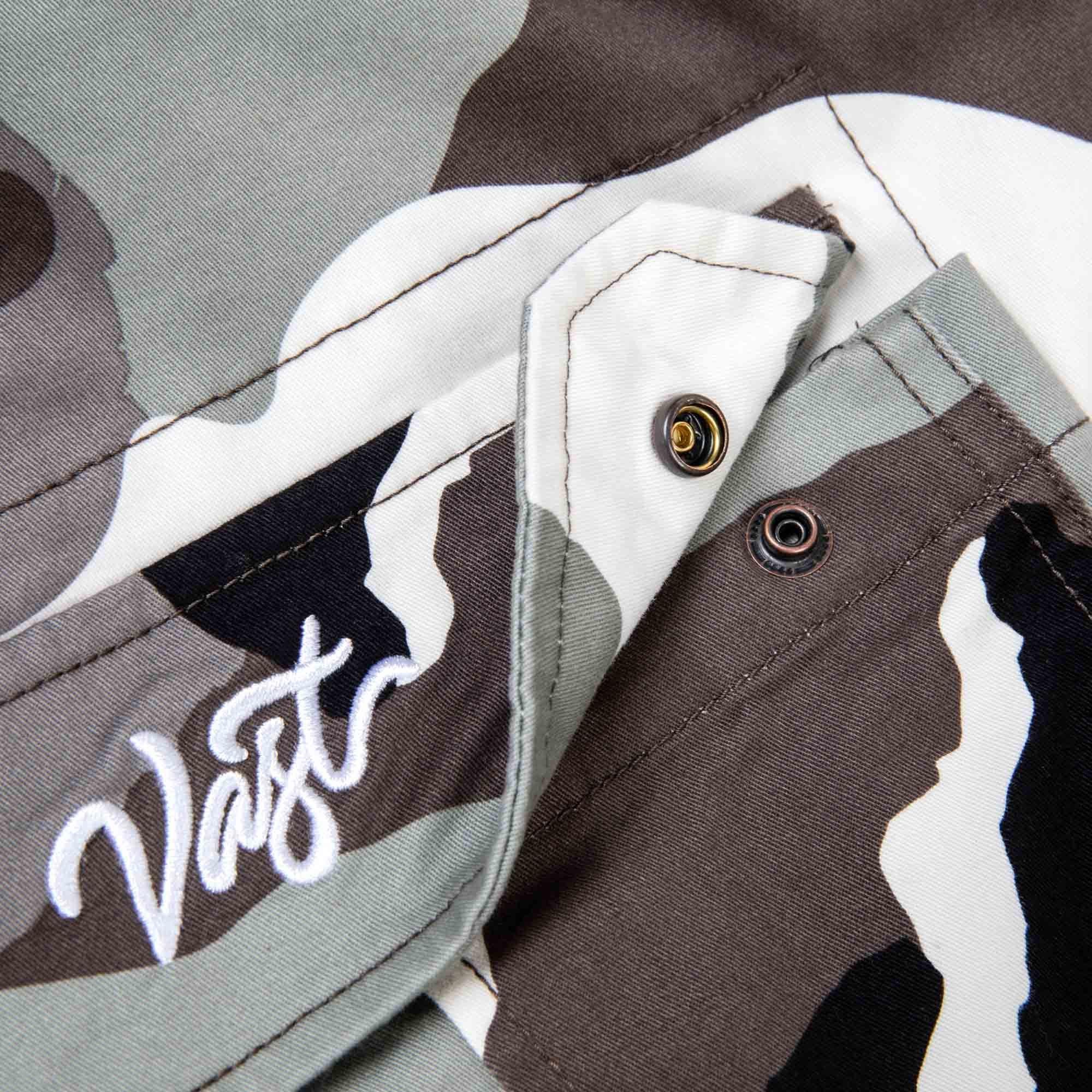 Utilitarian and durable military inspired camouflage shorts. Six pockets: cargo, side and rear with belt loops and drawstring bottoms. Vast scrip logo on right cargo pocket flap and Vast Elements patch on right rear pocket with 10” inseam. Made of 97% Cotton and 3% stretch blend fabric. Available in Camo and Dark Clay.