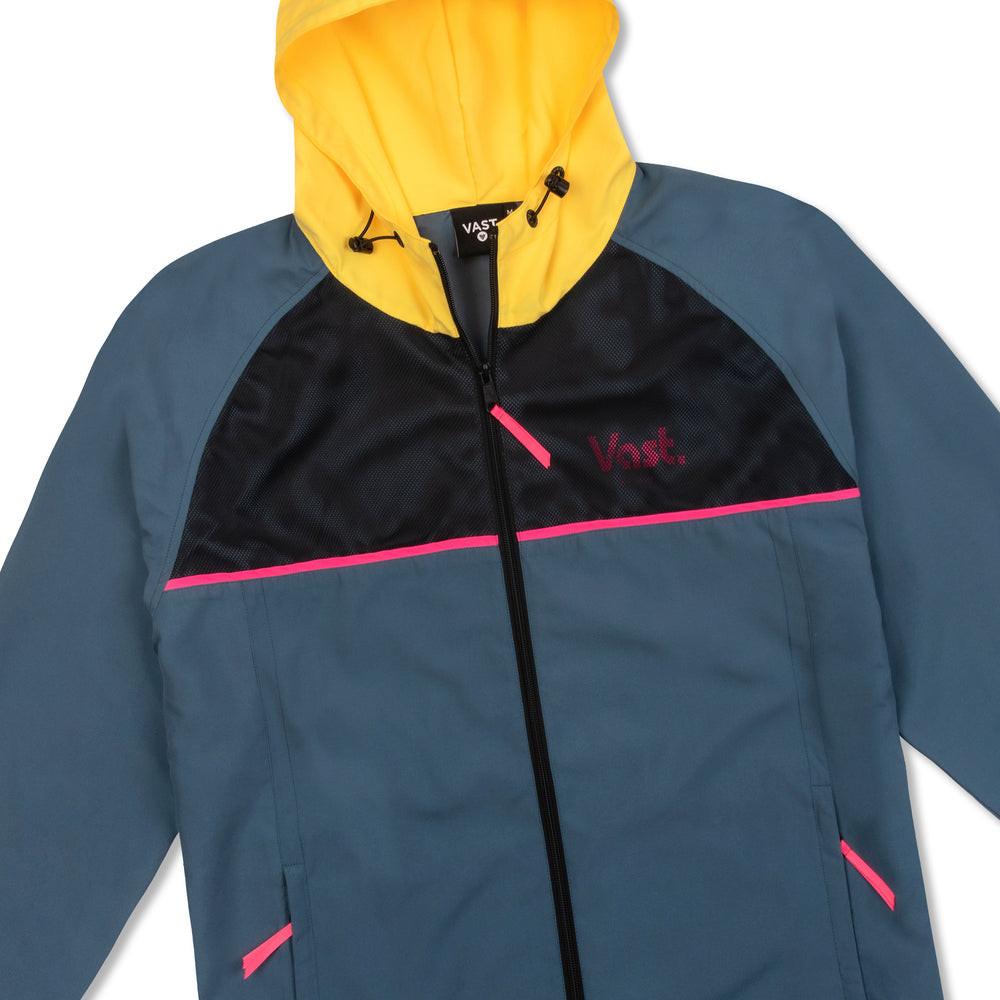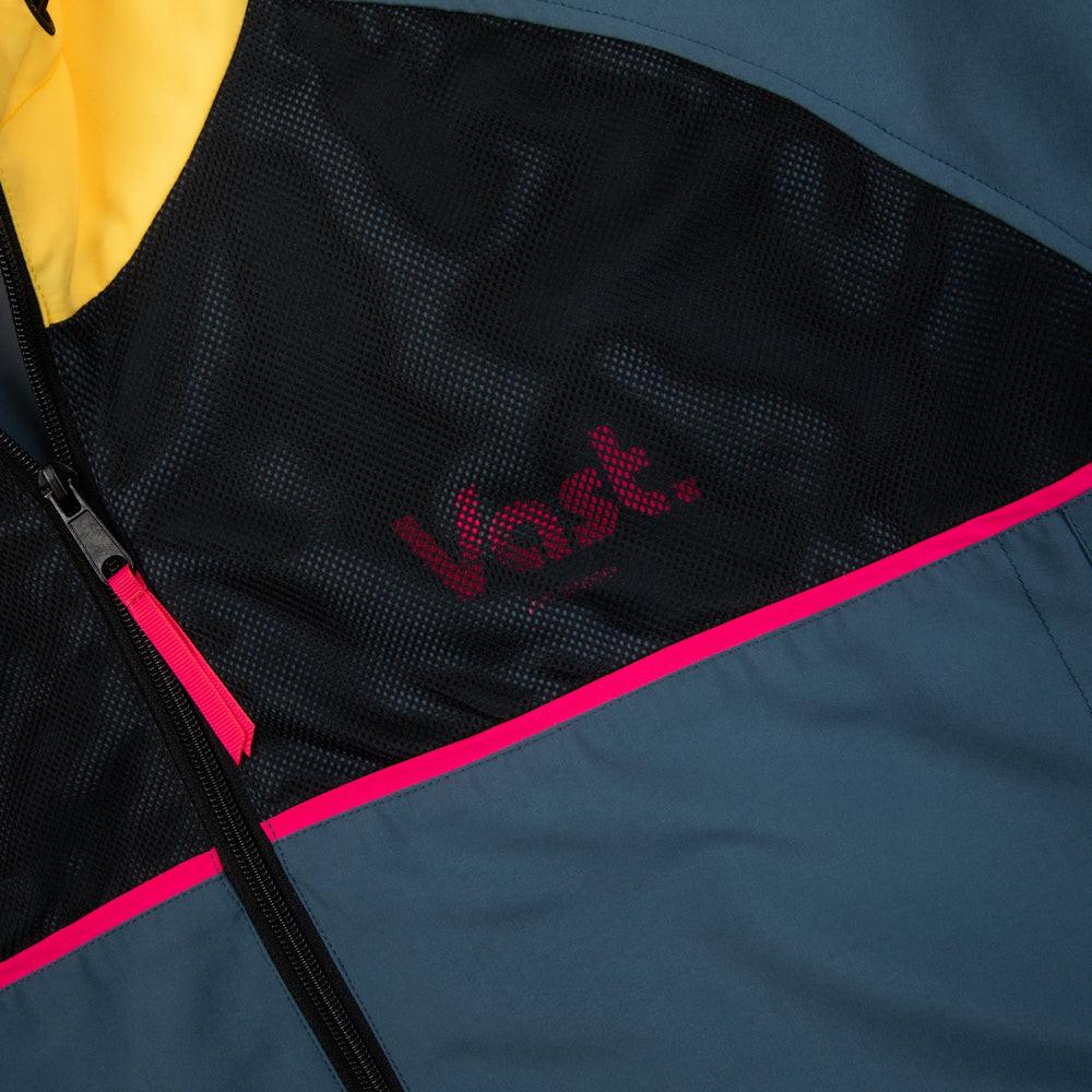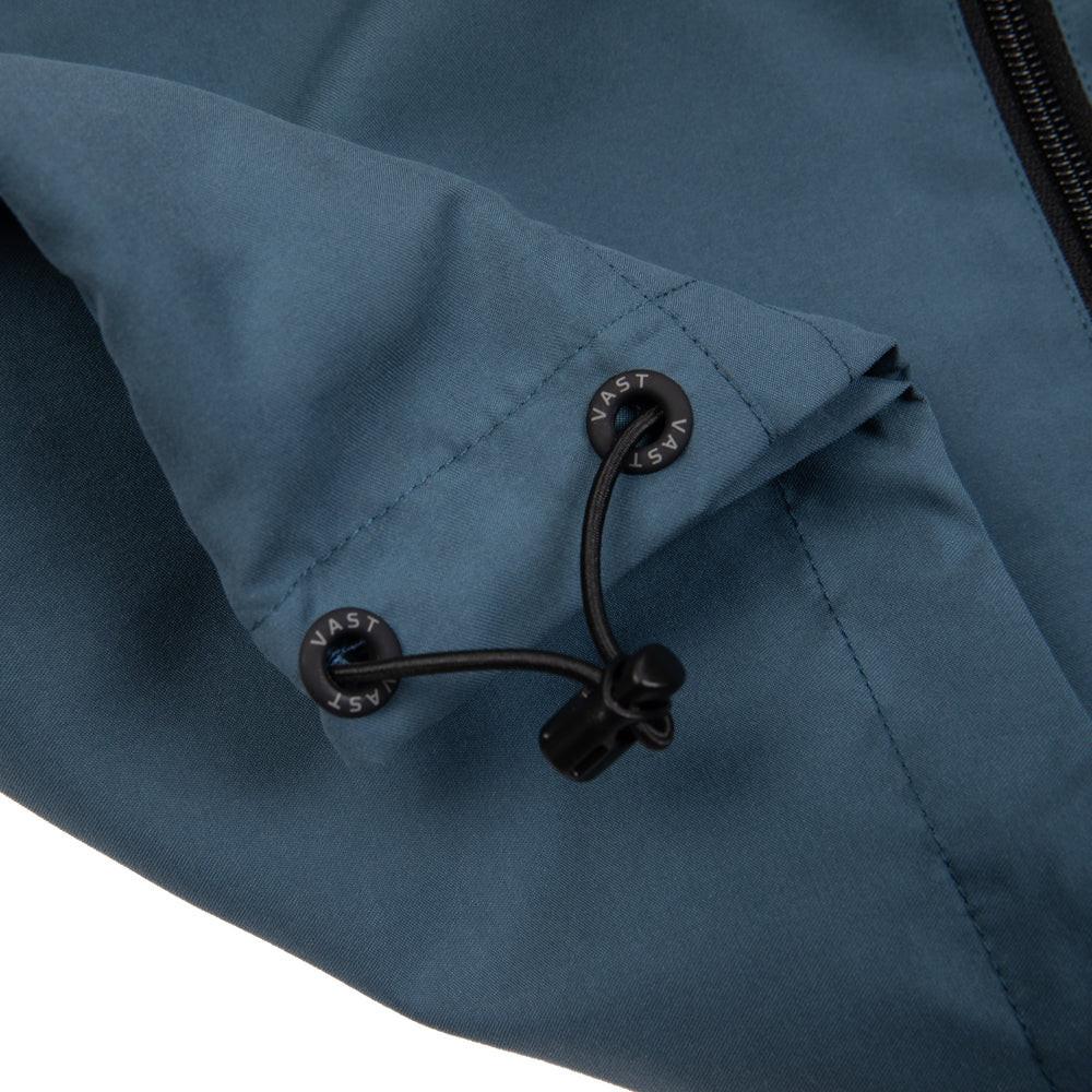 這款VAST 可收納防風外套耐用且防潑水,以獨特的配色設計展現個性風格。主體鋼藍色搭配亮黃色連帽,胸前與袖口滾邊採用復古紫紅色點綴,左胸印有VAST 復古標誌,低調中展現細節品味。