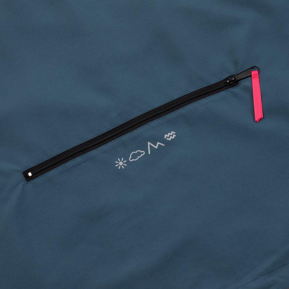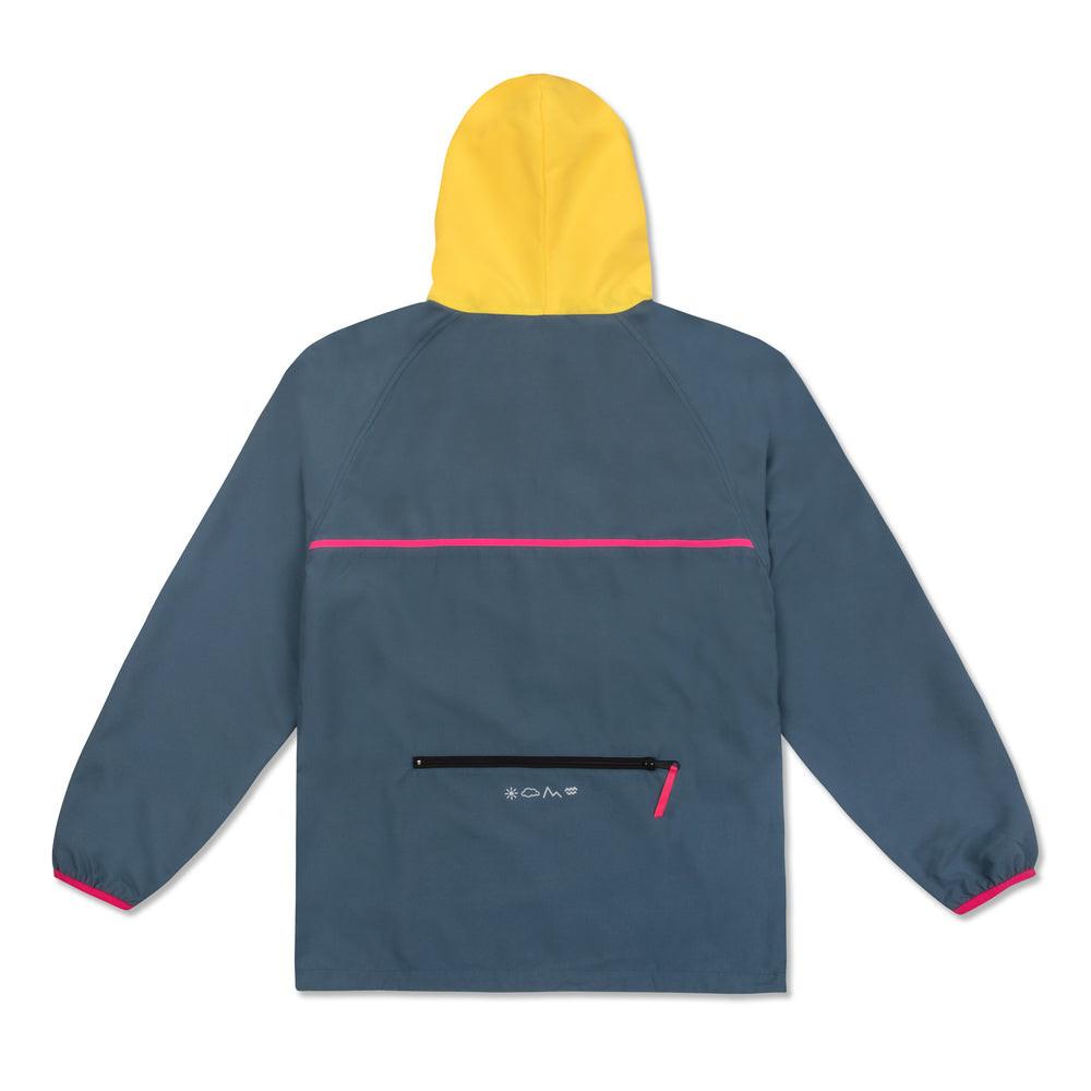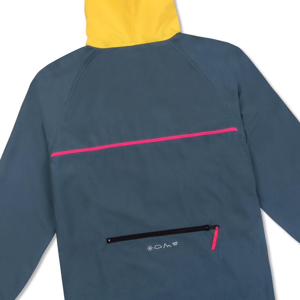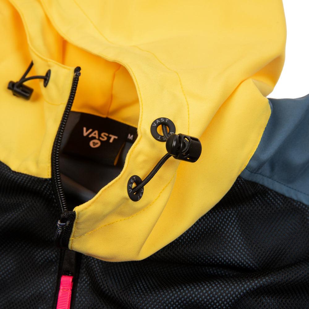 這款VAST 可收納防風外套耐用且防潑水,以獨特的配色設計展現個性風格。主體鋼藍色搭配亮黃色連帽,胸前與袖口滾邊採用復古紫紅色點綴,左胸印有VAST 復古標誌,低調中展現細節品味。