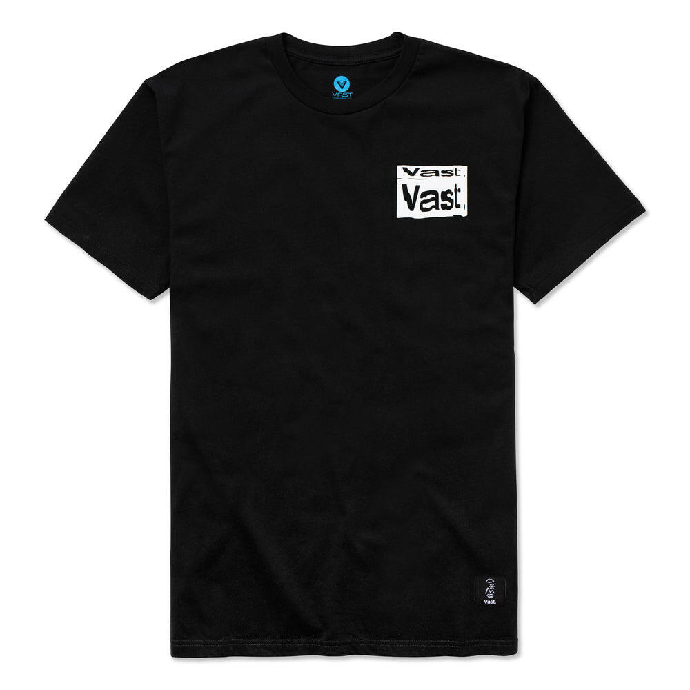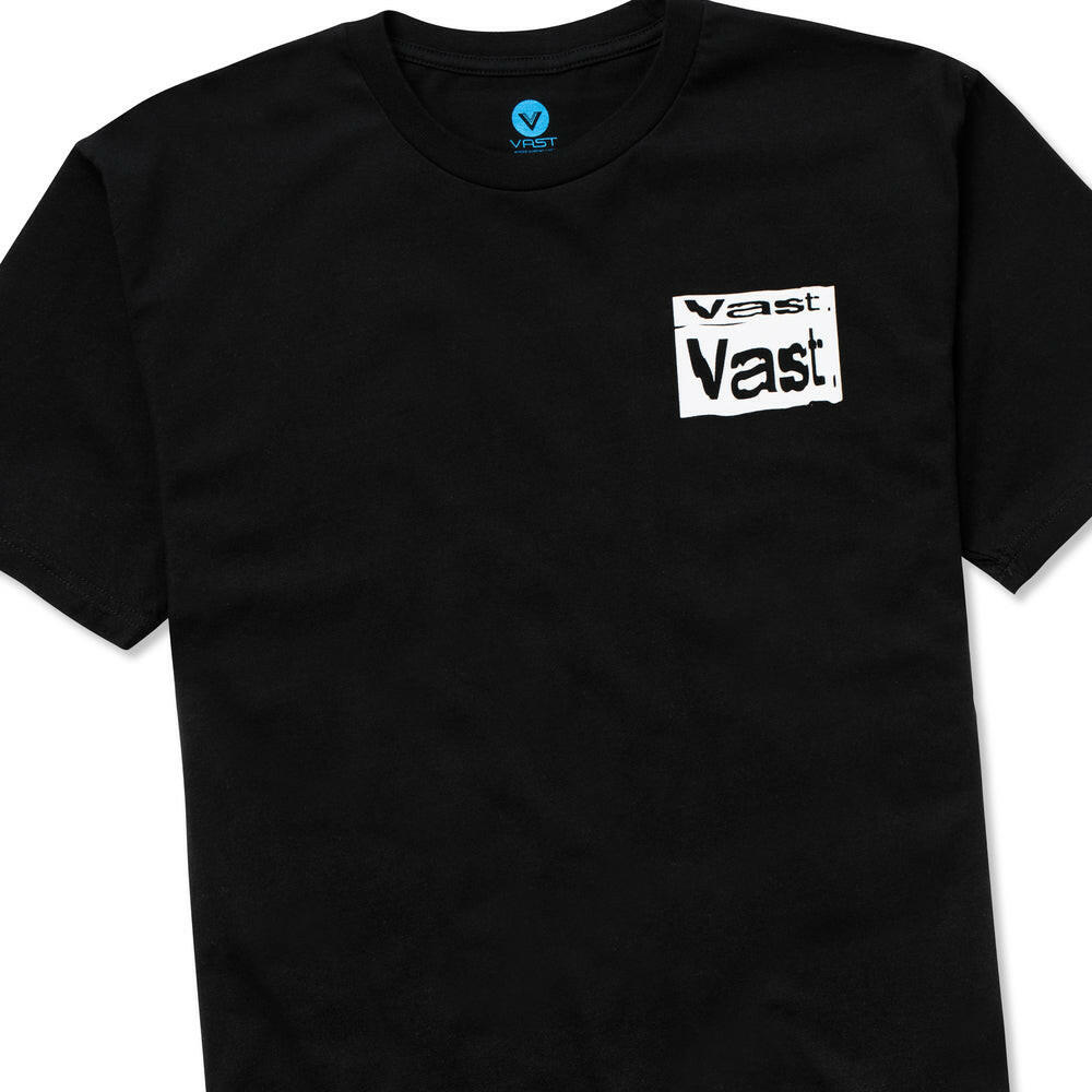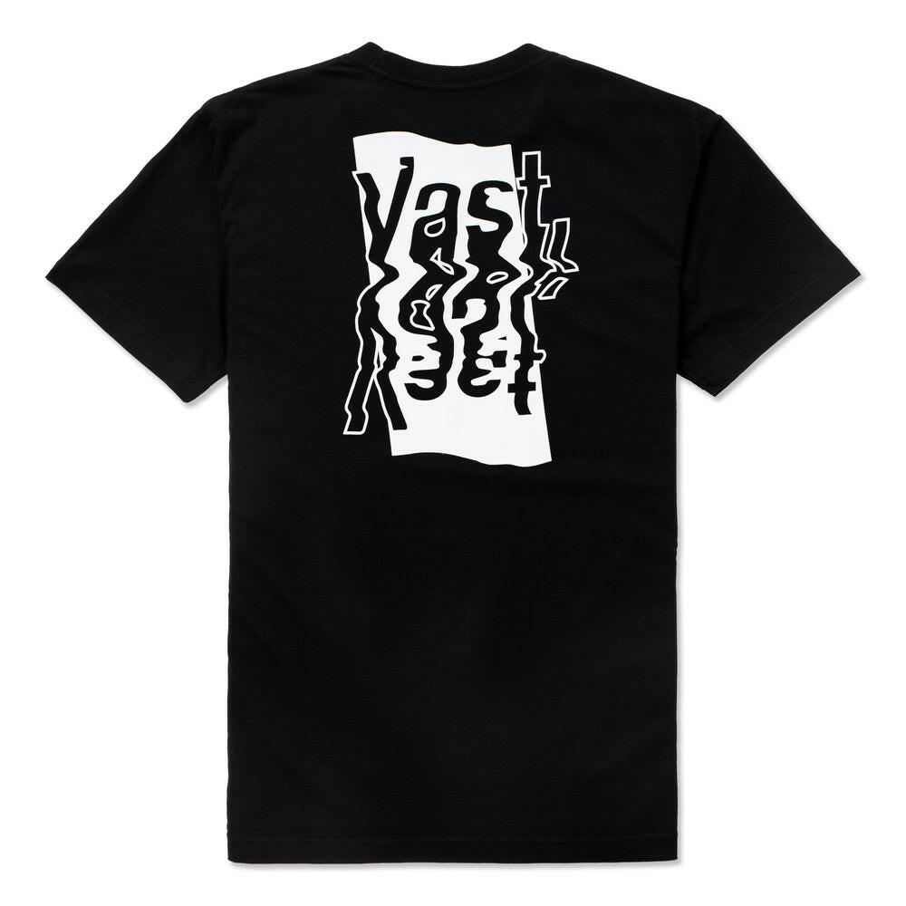 Heavily distorted Vast block logo stacked on front left chest and back. Simple black and white contrasting graphics. Vast Elements patch on front left hip. Premium fit t-shirt made from 100% ring spun combed Cotton with side seams and a ribbed collar. Size and instructions screen printed inside collar. Available in White and Black.