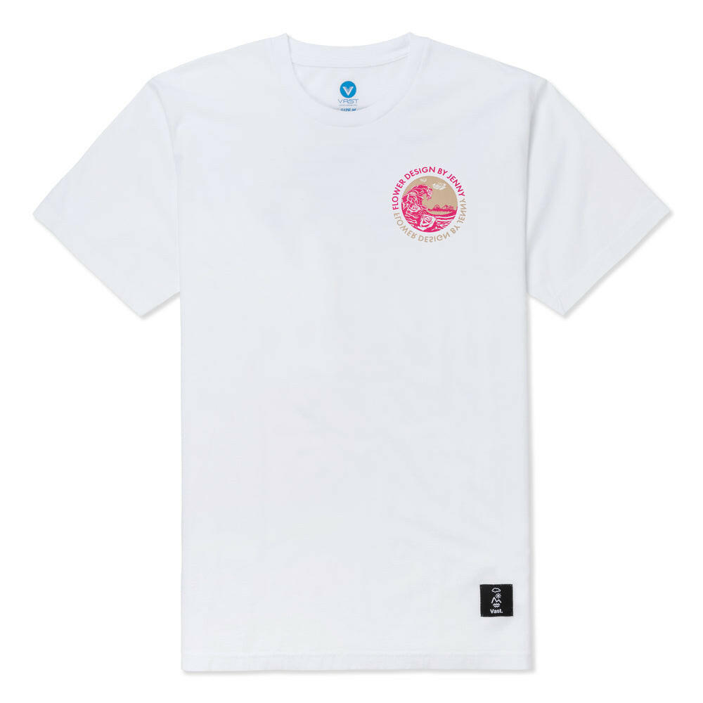 Hokusai inspired illustrations by artist Jenny. Wave crashing circle graphic on front left chest and larger back print. Elements patch on front left hip. Premium fit t-shirt made from 100% ring spun combed Cotton with side seams and a ribbed collar. Size and instructions screen printed inside collar. Available in Vintage Fuchsia and White.