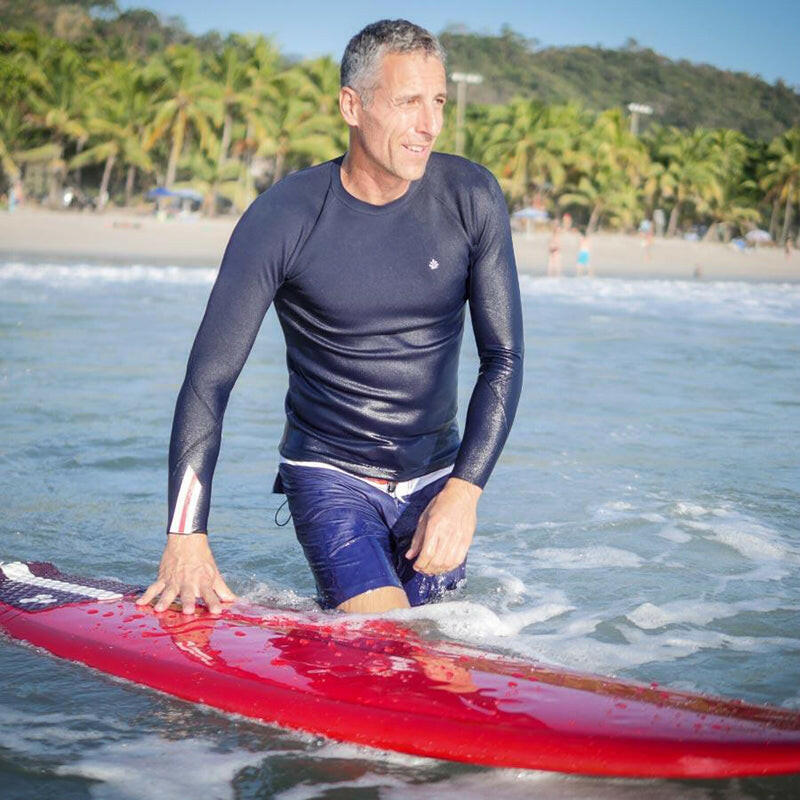 VAST 獨家選品 - 法國高訂衝浪防寒衣品牌 Saint Jacques,NOE 2mm Blue line 整件以沉穩低調的深藍色為主色系的半身長袖衝浪防寒衣,是海洋服飾首次跨足氯丁橡膠領域,專為各種水上運動而設計的科技服飾。