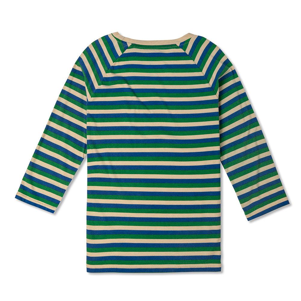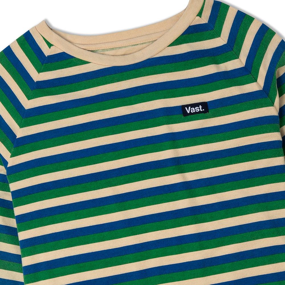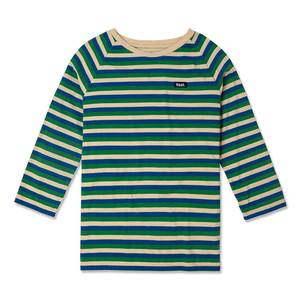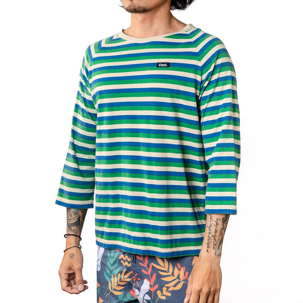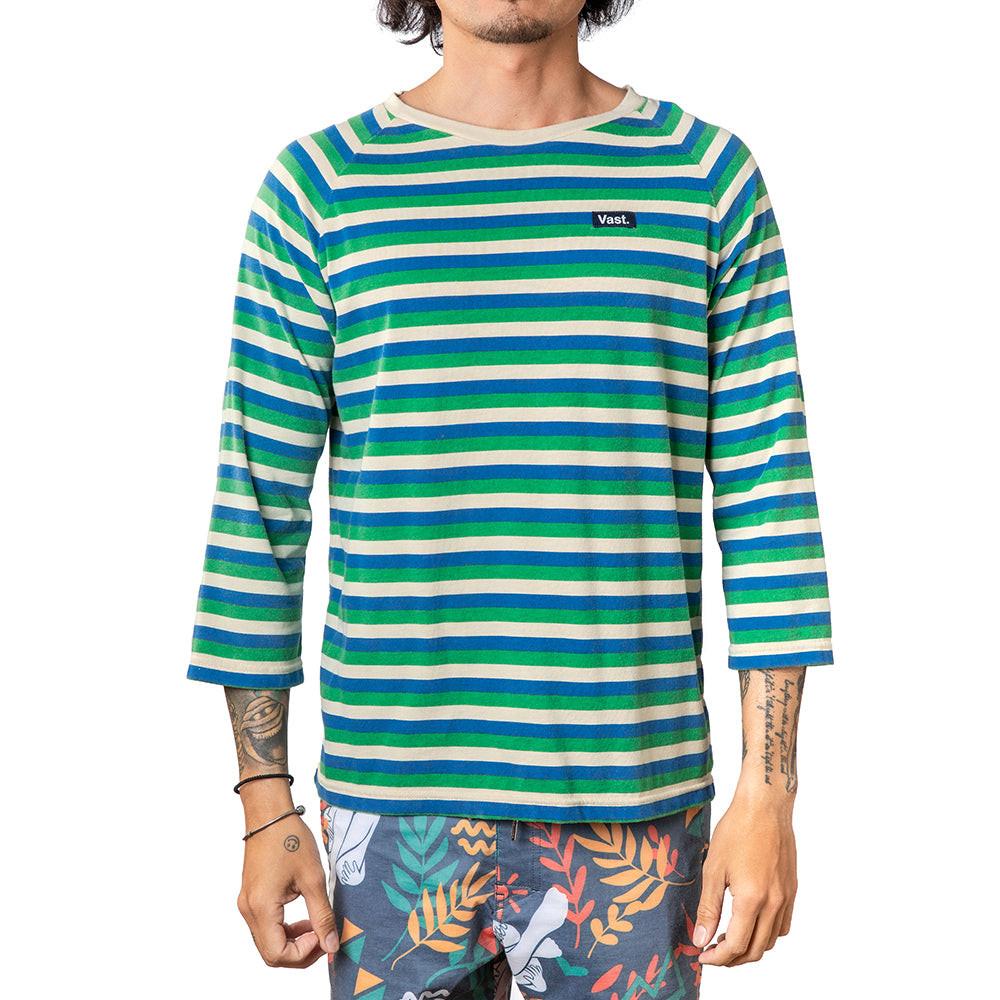 VAST 純棉七分袖上衣- 藍綠條紋採經典款橫條紋七分袖設計,左胸點綴簡約 VAST方形標誌,低調卻不失識別度。採用 100% 精梳純棉製成,觸感柔軟、舒適透氣,是日常穿搭的百搭單品。