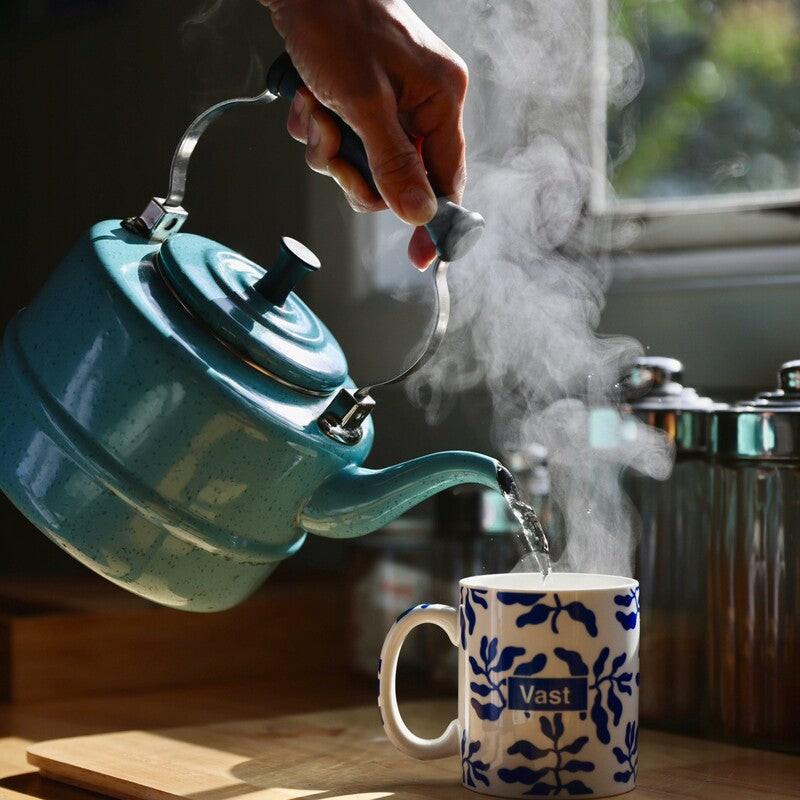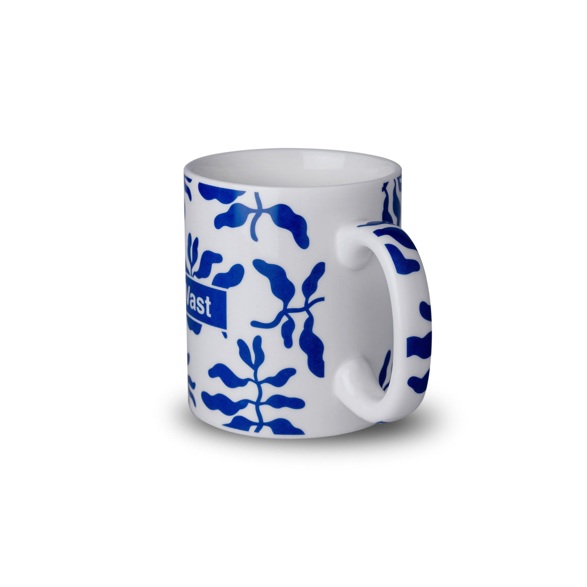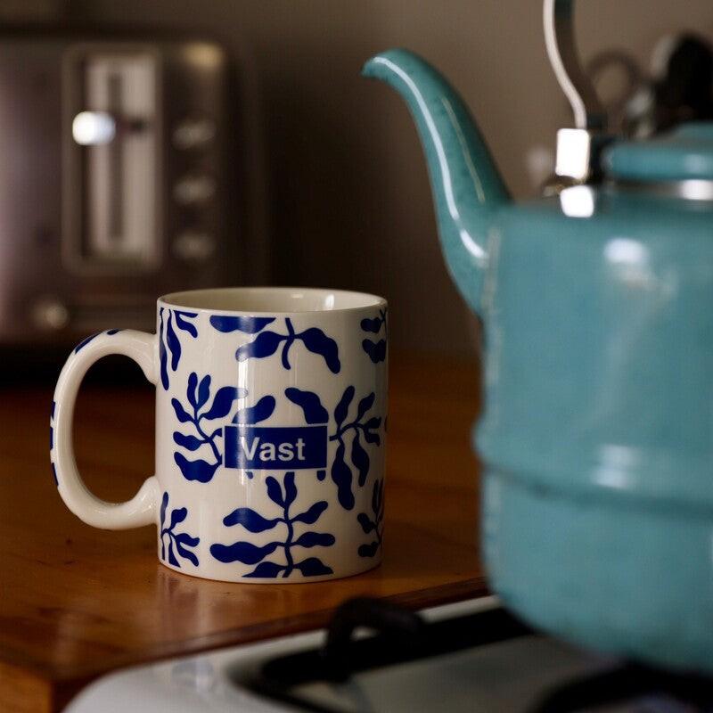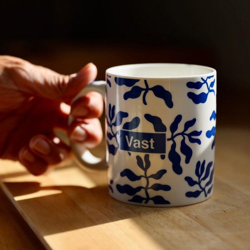 Funky Seaweed pattern Coffee Mug. Blue VAST Block logo printed at center. Abstract leaf pattern on mug and handle. Best for hot beverages but can hold all. Made of 100% Ceramic. Available in Blue.