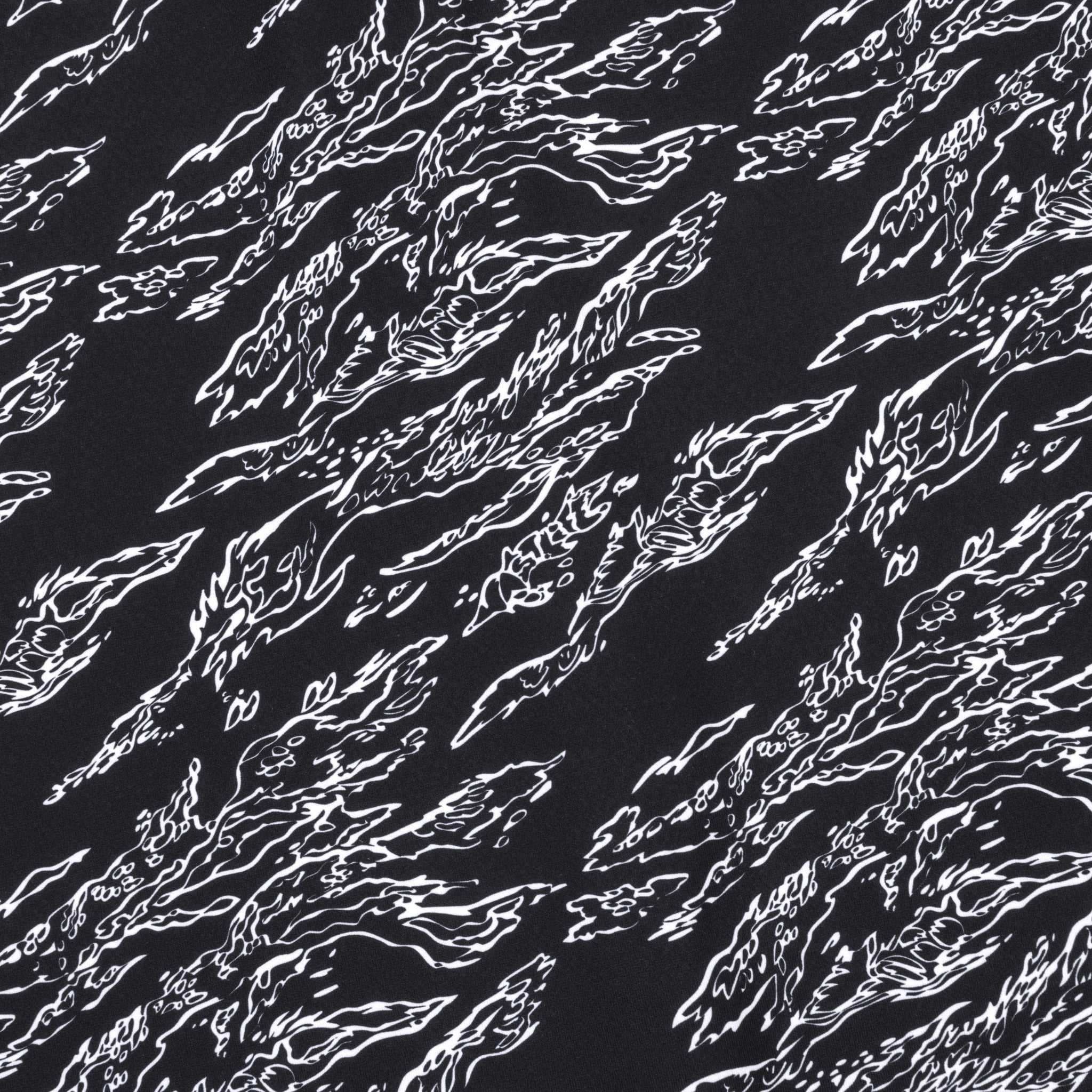 全版昇華印花的筆觸細膩流動,靈感源自大自然中的水流與地形紋理,抽象的黑白線稿在深邃的午夜底色上層層交疊,遠看是低調沉穩的迷彩氣場,近看卻藏著豐富的手繪細節與立體層次。前後片完整呈現圖騰,搭配俐落的扣釦剪裁與經典版型,穿上它,無需多餘配件,細節本身即是態度。