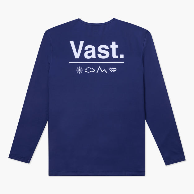 VAST 此款防曬機能衝浪長袖上衣,以Aqua Terra機能面料打造,以百搭的深藍色為底,深邃的海軍藍呈現簡約大氣的設計,正面醒目的白色 VAST logo 更為整體造型注入鮮明的品牌特色,而背面的 VAST Elements logo 圖樣設計也隱含著 Nature always wins 及守護環境的重要,讓下一代也有機會向當年那美好年代致敬的寓意。簡單俐落的款式輕鬆融入日常穿搭,無論是戶外運動還是城市生活,都能為型格浪人帶來舒適與自信。?