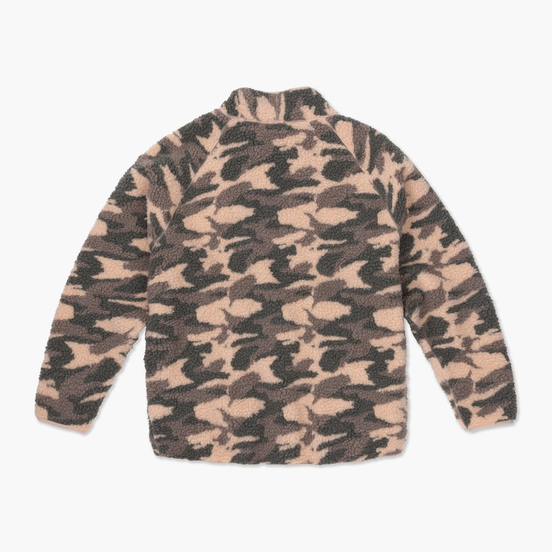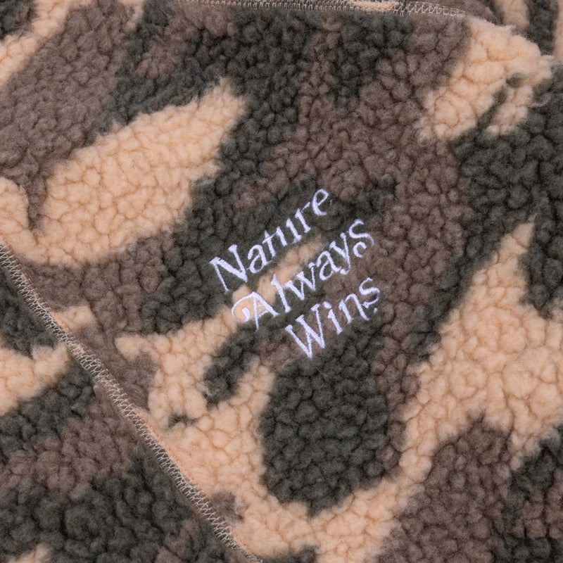 VAST 此款型格衝浪 Camo Sherpa Jacket 外套,以柔軟的毛絨面料裁製,綴滿經典迷彩印花圖案;採以寬鬆版型,搭配小立領設計;左襟繡以 "Nature always wins" 標誌,體現 VAST 一貫強調重視自然環境的理念。