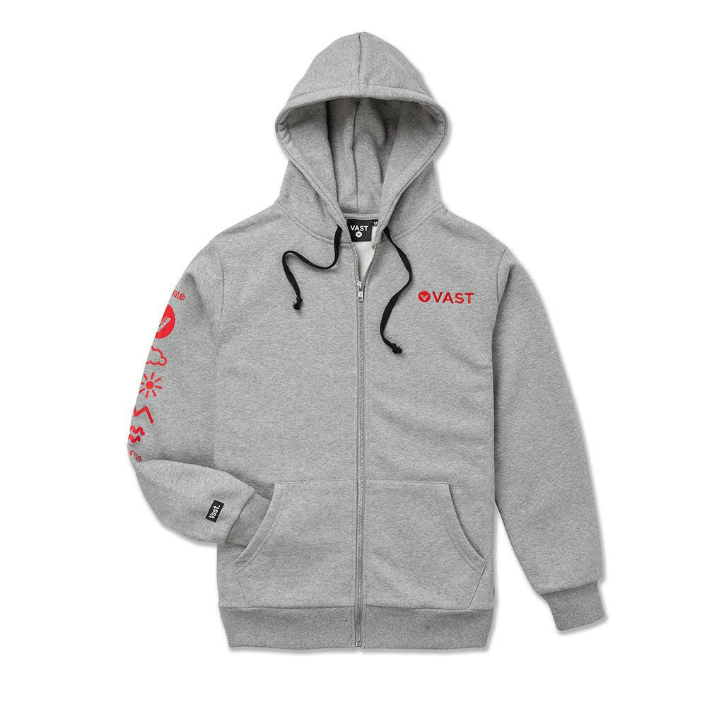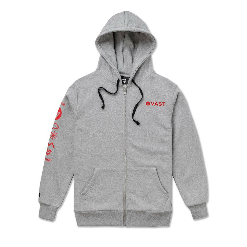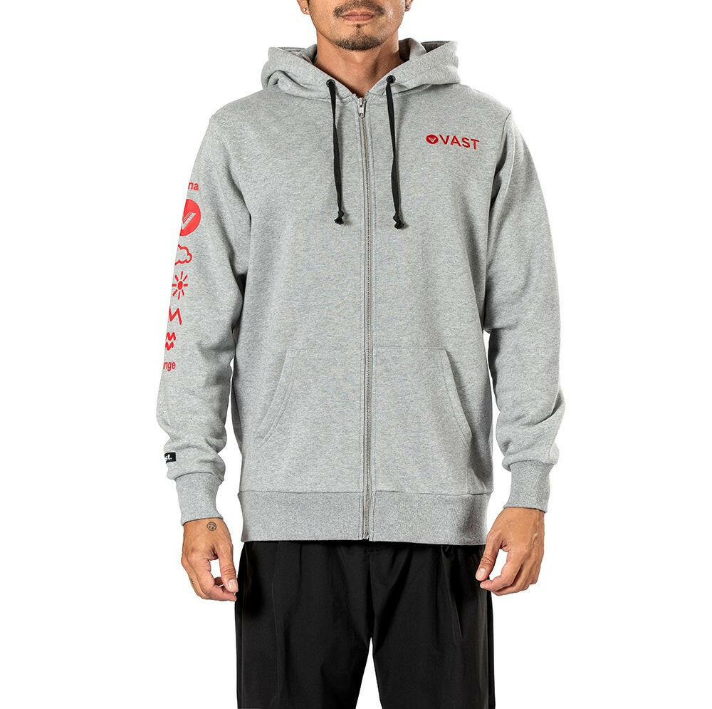 VAST 此款 Climate Change 拉鍊連帽外套,正面簡約設計在左胸前放上VAST Font logo。 右側袖上印有品牌精神自然元素圖標,表達我們對於大自然的崇愛,背後放大的Red Wave logo增加整體設計感這款連帽上衣採用 75%高級環錠紡精梳棉及25%聚酯纖維,有著優異的穿著舒適度;兩側皆有口袋設計,方便攜帶隨身物品。商品特色: