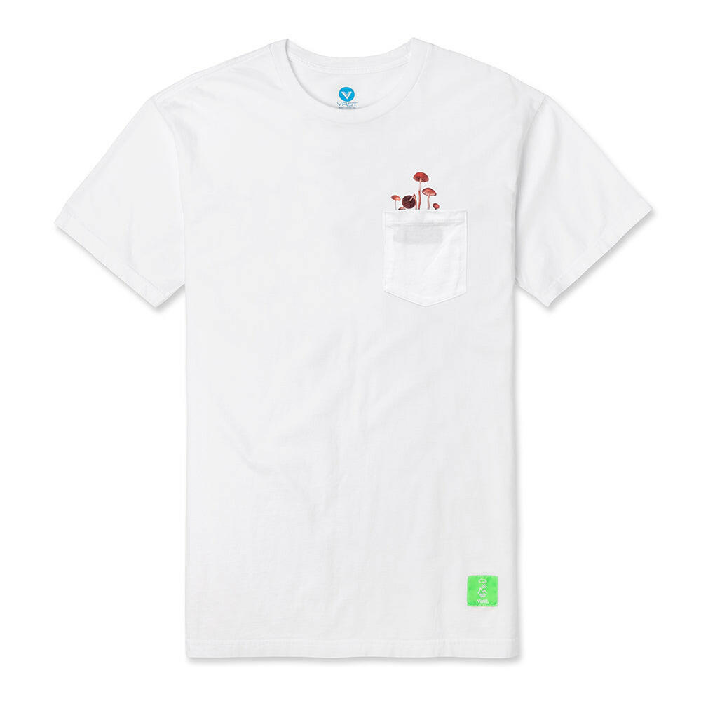 In a world of climate change, keep a visionary state of mind. With mushrooms growing from the front pocket and back of the tee. Be comfortable on all your trips in this super soft 100% cotton tee.