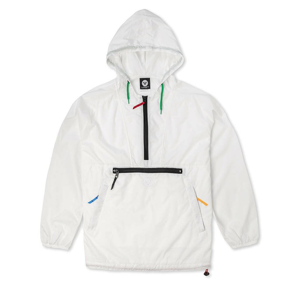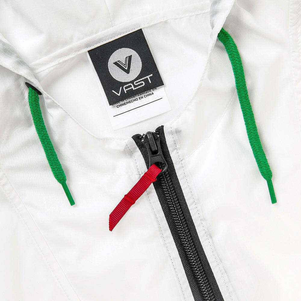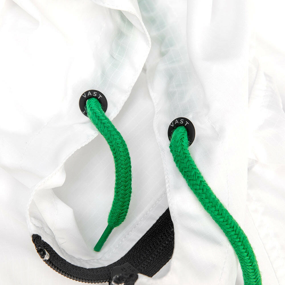 VAST 此款可翻轉防風夾克一面採用全白設計,俏皮顏色的綁繩讓這件上衣不無聊。兩面均配有側面拉鍊口袋和一個風帽口袋。商品特色: