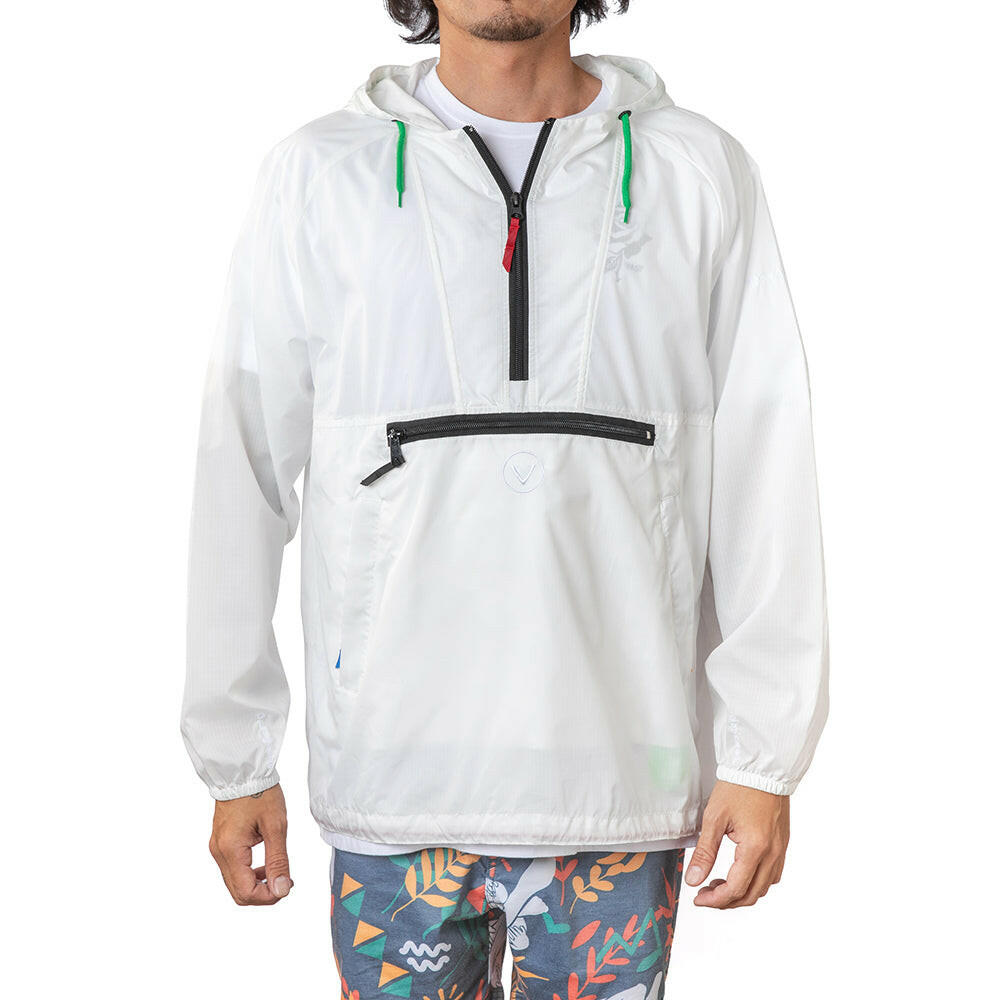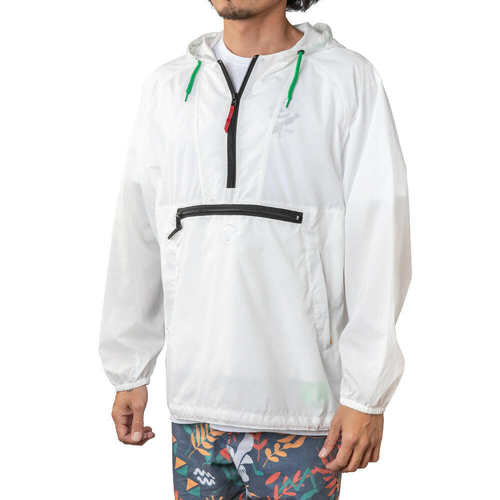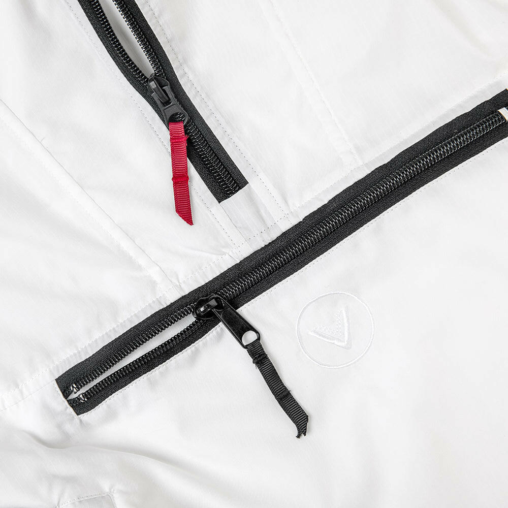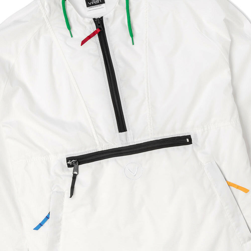 VAST 此款可翻轉防風夾克一面採用全白設計,俏皮顏色的綁繩讓這件上衣不無聊。兩面均配有側面拉鍊口袋和一個風帽口袋。商品特色: