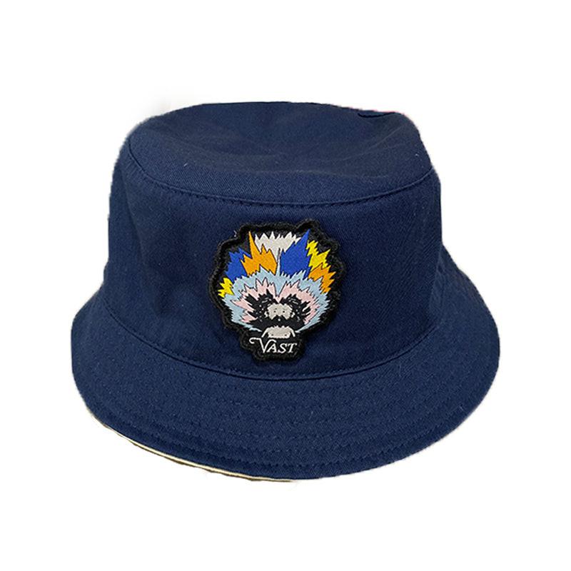 Versatile two sided bucket hat. Navy print for day time and flat white to go night mode. 1% Cotton. Yogi Fro logo on left of Navy side and VAST vintage logo on left of White side. 6 rows of stitching on the full circle brim. Available in Navy / Khaki.