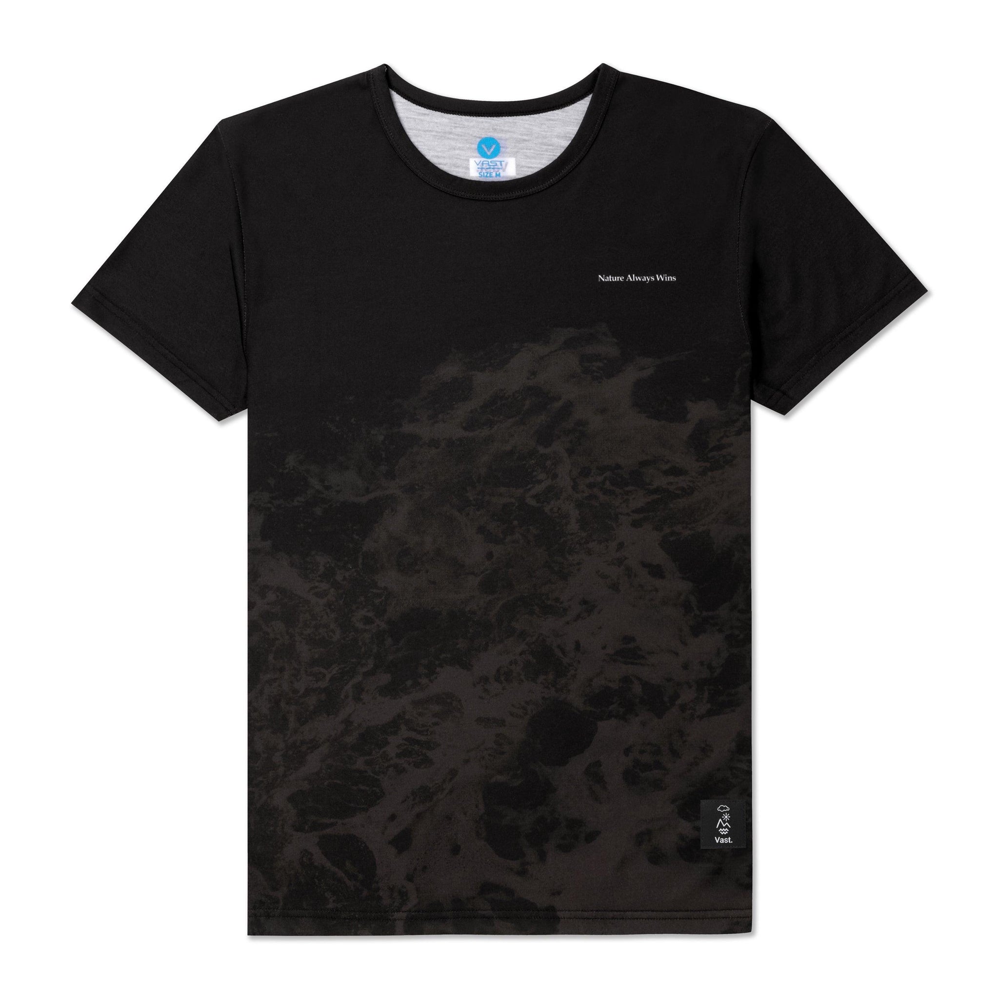 Inspired by our travels to coastal hubs around the planet, our SeaFoam tee features a 3/4 body ocean print. Nature Always Wins printed on the left front chest. Premium fit t-shirt made from 1% Polyester with side seams and a ribbed collar. VAST Block logo printed on back shoulders, centered. Available in Tan and Black.