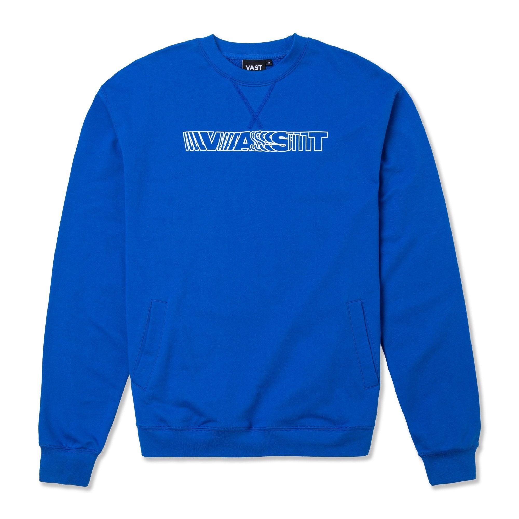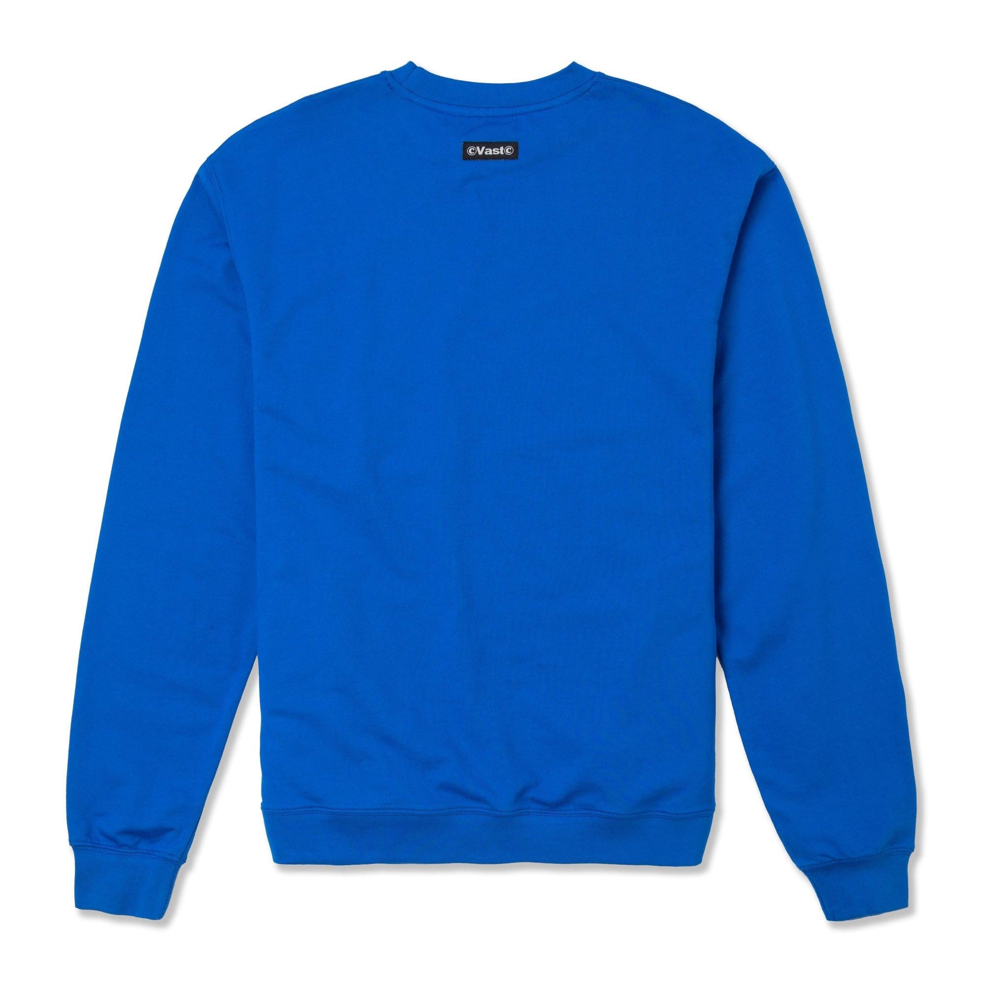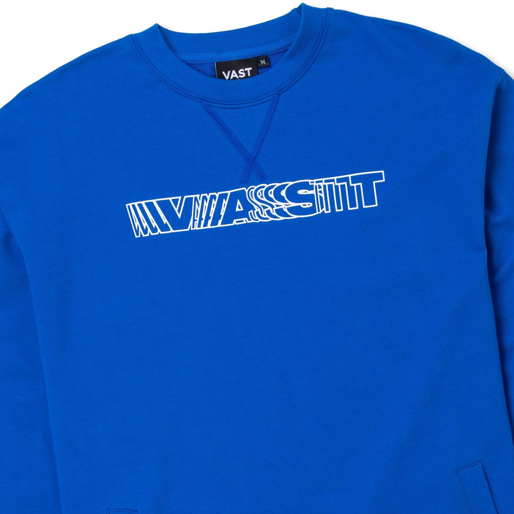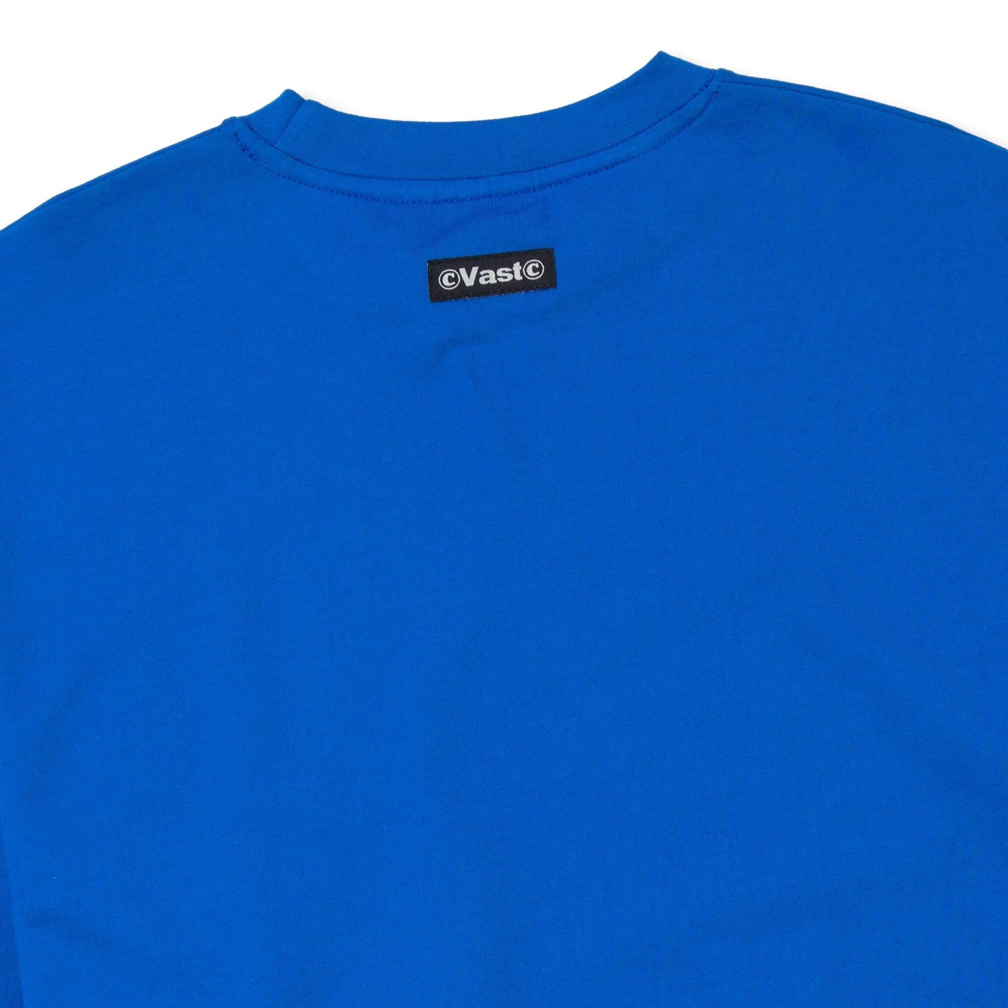 VAST x CJ DUNN 藍色長袖大學T以字體藝術家 CJ Dunn 設計的動態排版圖樣為視覺主軸,結合品牌風格與藝術表現,展現強烈個性與設計感。採用高質感 75% 棉與 25% 聚酯纖維混紡面料,柔軟舒適、耐穿實用。設有雙側插手口袋與側邊車縫結構,領口採用平整包縫 V 型車線,有效控制穿脫時的拉扯變形。標準羅紋下擺與袖口設計,右前下擺飾有 VAST 方形標誌,細節低調而有識別度。