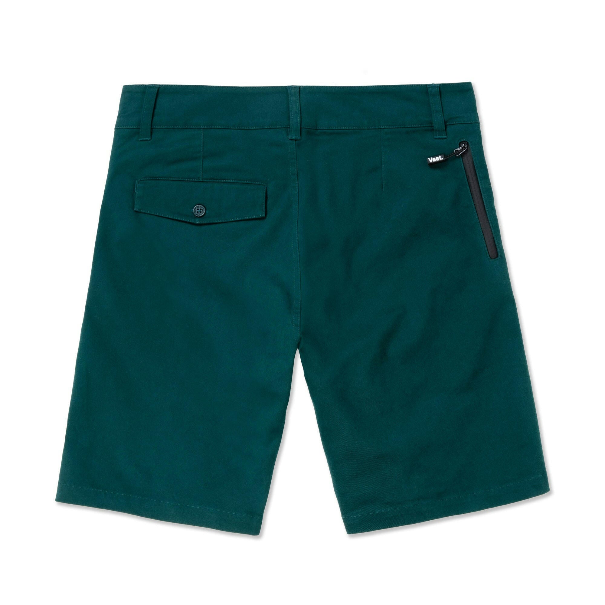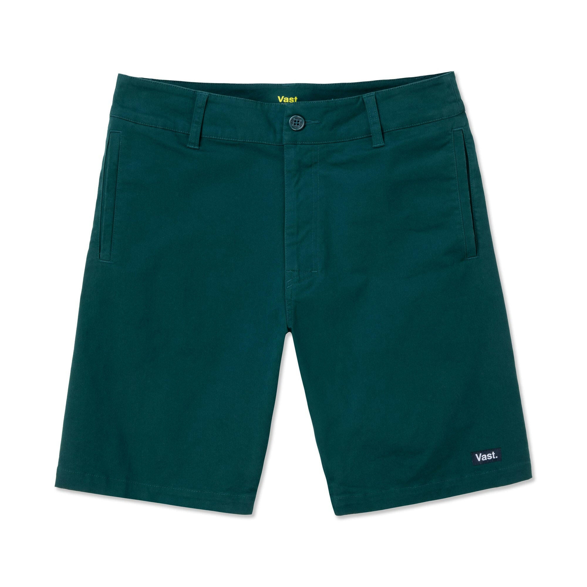 Our classic, simple walk shorts. Side pocket on right hip with zipper closure, rear pocket with button flap and 8” inseam. Vast block logo on front left knee and belt loops. Made of 97% Cotton and 3% stretch blend fabric. Available in Navy and Green.