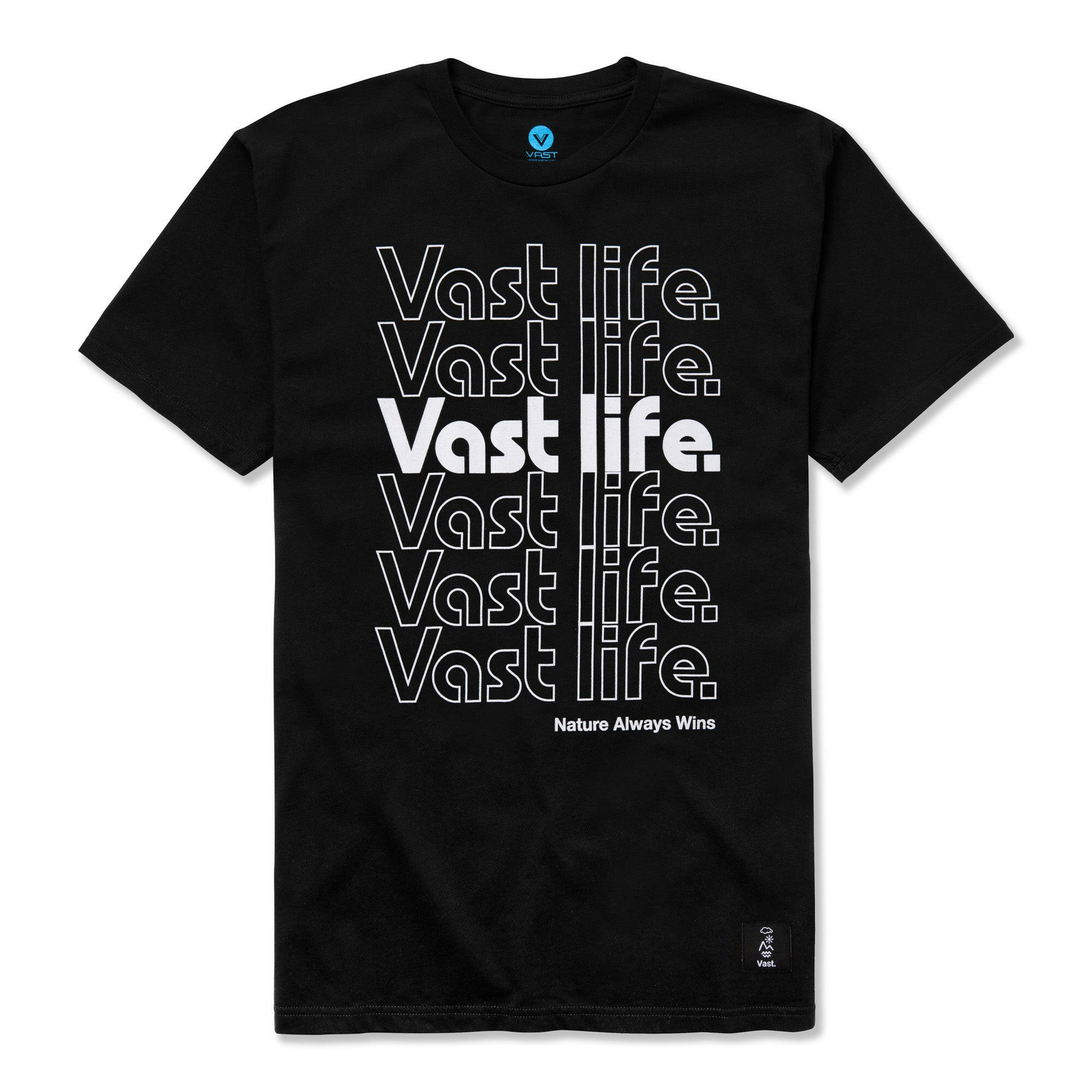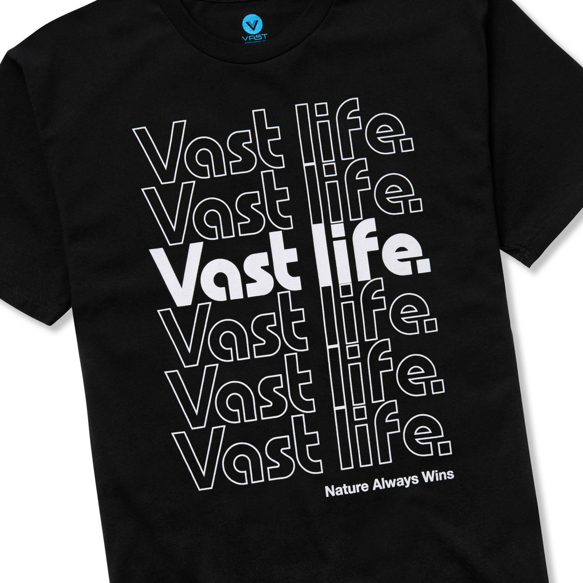 Helvetica block type graphic tee. Multiple Vast life text down the front chest.